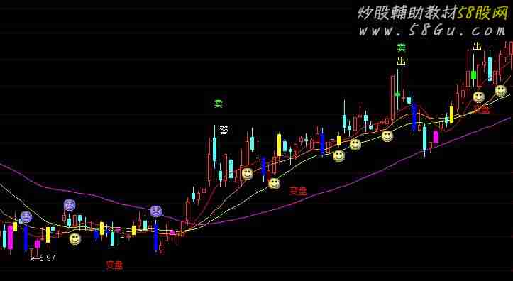 MA7:MA(C,7),COLOR0000FF;MA13:MA(C,13),COLOR0096FF;MA21:MA(C,21),COLOR00FF99;MA49:MA(C,49),COLORFF00FF;A:=BARSCOUNT(CLOSE);AH:=HHV(HIGH,200);AL:=LLV(LOW,200);B0:=(AH-AL)/40;B1:=HIGH+B0;B2:=LOW-B0;DRAWTEXT((A+0)/34=FLOOR((A+0)/34),B2-2.2*B0*1.1,'变盘'),COLORRED;DRAWTEXT(IF(CROSS(69,SMA(MAX(CLOSE-REF(CLOSE,1),0),13,1)/SMA(ABS(CLOSE-REF(CLOSE,1)),13,1)*100),1,0),HIGH*1.045,'警'),COLORWHITE;LC:=REF(CLOSE,1); RSI:=SMA(MAX(CLOSE-LC,0),4.1,1)/SMA(ABS(CLOSE-LC),4.1,1)*100; DRAWICON(CROSS(RSI,11) ,L*0.99,3);VAR28:=SMA(MAX(CLOSE-LC,0),5.5,1)/SMA(ABS(CLOSE-LC),6,1)*100;DRAWTEXT(FILTER(EMA(CLOSE,60)-EMA(CLOSE,12)>0 AND EMA(CLOSE,12)/LOW>1.15,5),LOW,'买'),COLORFF00FF;VARA:=((AMOUNT)/(VOL))/(100);VARB:=((3)*(HIGH)+LOW+OPEN+(2)*(CLOSE))/(7);VARC:=((SUM(AMOUNT,7))/(VARA))/(100);VARD:=DMA(VARB,(VOL)/(VARC));VARE:=((CLOSE-VARD)/(VARD))*(100);VARF:=((CLOSE-LLV(LOW,34))/(HHV(HIGH,34)-LLV(LOW,34)))*(100);VARJ:=MA(VARE,20)+STD(VARE,20);BIAS18:=((CLOSE-MA(CLOSE,18))/(MA(CLOSE,18)))*(100);AA:=SMA(VARF,3,1);SS:=(REF(BIAS18,1)>=5) AND CROSS(VARJ,VARE) AND (AA>79);DRAWTEXT((REF(BIAS18,1)>=5) AND CROSS(VARJ,VARE) AND (AA>SS) AND CROSS(84,RSI),H*1.028,'卖'),LINETHICK7,COLORGREEN;DRAWTEXT(CROSS(84,RSI) AND CROSS(76,VAR28),H*1.01,'出'),LINETHICK7,COLORYELLOW;买线:=EMA(C,2);卖线:=EMA(SLOPE(C,13)*21+C,49); STICKLINE(CROSS(买线,卖线),OPEN,CLOSE,1.2,0),COLORYELLOW;STICKLINE(CROSS(卖线,买线),OPEN,CLOSE,1.2,0),COLORBLUE;V1:=EMA(CLOSE,60)-EMA(CLOSE,300);V2:=EMA(V1,300);V3:=(CLOSE-LLV(LOW,8))/(HHV(HIGH,8)-LLV(LOW,8))*100;操盘线:=SMA(V3,2,1),LINETHICK3;V5:=SMA(操盘线,2,1);DRAWICON(CROSS(操盘线,V5) AND MA7>REF(MA7,1),L*0.987,5);DRAWICON(操盘线<REF(操盘线,1) AND REF(操盘线,1)>REF(操盘线,2) AND MA21<REF(MA21,1) AND REF(操盘线,1)>40 AND CROSS(V5,操盘线),H*1.01,6);STICKLINE((REF(BIAS18,1)>=5) AND CROSS(VARJ,VARE) AND (AA>SS) AND CROSS(84,RSI) AND CROSS(76,VAR28),C,O,3,0),COLORGREEN,LINETHICK2;{底位红色}STICKLINE(操盘线>REF(操盘线,1) AND CROSS(操盘线,V5) AND V5<50 AND MA13<REF(MA13,1),C,O,3,0),COLORMAGENTA,LINETHICK2;{底位红色}; |