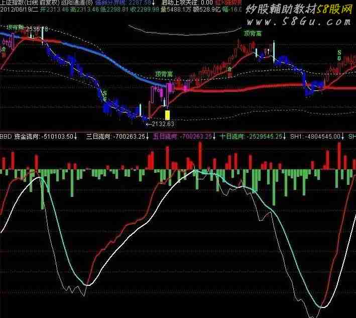 BBD 超B:=L2_AMO(0,2)/10000.0; 大B:=L2_AMO(1,2)/10000.0; 中B:=L2_AMO(2,2)/10000.0; 小B:=L2_AMO(3,2)/10000.0; 超S:=L2_AMO(0,3)/10000.0; 大S:=L2_AMO(1,3)/10000.0; 中S:=L2_AMO(2,3)/10000.0; 小S:=L2_AMO(3,3)/10000.0; 资金流向:(超B+大B+中B+小B)-(超S+大S+中S+小S),NODRAW; STICKLINE(资金流向>0,0,资金流向,2,0),COLORRED; STICKLINE(资金流向<0,0,资金流向,2,0),COLORLIGREEN; 三日流向:SUM(资金流向,5),NODRAW; 五日流向:SUM(资金流向,5),NODRAW; 十日流向:SUM(资金流向,10),NODRAW; SH:=SUM(资金流向,15),COLOR0000FF; SH1:SMA(SH,3,1); SH2:=SMA(SH1,3,1); SH3:SMA(SH2,3,1),LINETHICK2,COLORCYAN; IF(SH3<SH1,SH3,DRAWNULL),COLORWHITE,LINETHICK2; IF(SH1>SH3,SH1,DRAWNULL),COLORRED,LINETHICK2; |