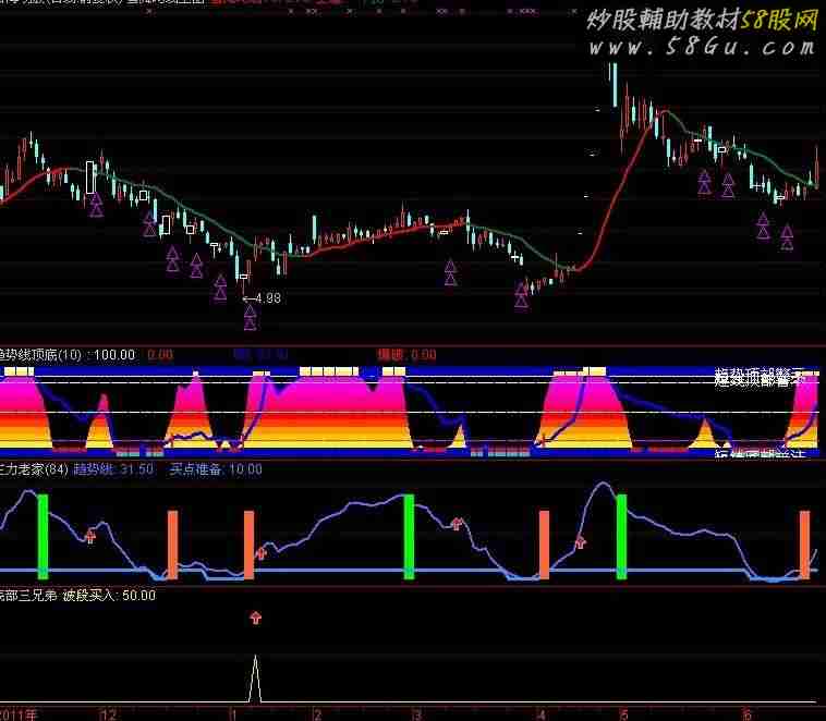 VAR1:=(CLOSE+HIGH+LOW+OPEN)/4; VAR2:=SUMBARS(VOL,CAPITAL); VAR3:=HHV(VAR1,VAR2); VAR4:=LLV(VAR1,VAR2); VAR5:=(2*VAR1-VAR4-REF(VAR4,1))/(VAR3-VAR4); VAR6:=(VAR1-VAR4)/(VAR3-VAR4); VAR7:=IF(VAR1<=VAR4,VAR5*60,VAR6*60); VAR8:=600*(EMA(CLOSE,3)-EMA(LOW,30))/EMA(LOW,30); VAR9:=EMA(VAR8,7); VARA:=(WINNER(120*CLOSE/100)-WINNER(100*CLOSE/100))*100; 波段买入: IF(VARB<7 AND CROSS(VAR8,VAR9) AND VAR9<-18 AND VAR9<VARB,60,50),COLORYELLOW ; DRAWICON(波段买入=60,70,1),COLORRED;