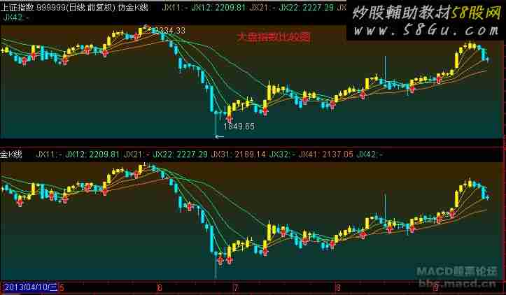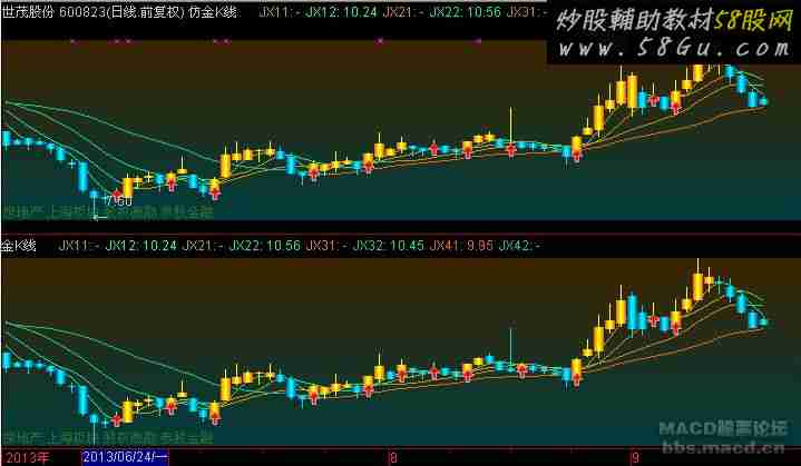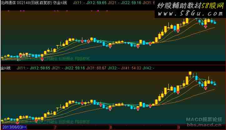 【金K线】主图,以前谓之“终极版”,后更名谓之“完美波段操作版”,因在论坛贴过不少图片,以致不少人希望能得到,私下也给极少数人发过。 后来论坛也出现了不少似是而非的“金K线”,不少人还以为就是我的版本。 我本不打算理会,但想到这可能给一些筒靴带来困惑,所以还是决定将我的【金K线】公之于众,不过,这也不是原来的“完美版”,而是“高仿真版”。 说到“仿”,可能一些筒靴会误会,以为我舍不得原版本,我想先做个简单的解释: 原版本的源码涉及到一些比较私人的内容,而且在通达信以外的软件里可能找不到替用函数,所以不予发布,敬请理解。高仿版与原版本只是源码不相同,但在主图上的显示基本一样,虽有一点点微不足道的差异,不过基本可以忽略。后面我会贴图比较,大家看看就知道了。特别提醒的是,高仿版是本人所制,力图跟原版本一致,以完全替用【金K线】,所以完全可以名之曰我的【金k线】,我之所以加个副标题“高仿真版”,只是为便于我自己区别,而且免费外发的【金K线】源码,此“高仿版”就是最终版本了。 这里我发的是源码,源码适用通达信软件,若是其他软件不能适用,请自己修改,若不能修改,建议下载通达信使用。这里我不是替通达信做宣传,实在是我自己习惯了通达信,不愿更换别的软件,纯粹个人爱好。 从比较图可以看出,差异极小,而且有的地方,仿版还优于原版。 指标,仅仅是提供一种分析,为自己的交易决策壮胆而已。 交易,不仅需要好的工具,更需要善用工具。 【金K线】是适用于所有股票的指标,所以他本身就不可能带有“偏见”,而选择什么样入场点,是需要“偏见”的。 我说的“偏见”,是指不同于大众的切入点,是个人的买卖点,而个人的喜好就是一种偏见,但个人的偏见又必须顺从于大众,否则就可能被市场抛弃或击垮。 因此,有了【金K线】,我们还需要做很多工作,从【金K线】里找到自己的“偏见”,并经过多次检验,形成自己的交易决策,这样,【金K线】才最终能达到“有了金K线,赚钱不再难”的目的DRAWGBK(O>=0,RGB(60,35,0),RGB(0,60,60),0,'背景图',0); DRAWKLINE(H,O,L,C); CL:=(3*C+2*O+H+L)/7; Z1:=STRCAT(HYBLOCK,' ');Z2:=STRCAT(Z1,DYBLOCK);Z3:=STRCAT(Z2,' '); DRAWTEXT_FIX(ISLASTBAR,0,1,0,STRCAT(Z3,GNBLOCK)),COLOR336836; {特注,此公式为【仿金K线】,虽略有差异,差异不大,可以替用【金K线】} KA:=EMA(CL,2); A1:=MA(CL,3); A2:=MA(CL,6); A3:=MA(CL,12); A4:=MA(CL,24); JX11:IF(BACKSET(A1>=REF(A1,1),2),A1,DRAWNULL),COLOR00AABB; JX12:IF(BACKSET(A1<=REF(A1,1),2),A1,DRAWNULL),COLORAAFF00; JX21:IF(BACKSET(A2>=REF(A2,1),2),A2,DRAWNULL),COLOR0099CC; JX22:IF(BACKSET(A2<=REF(A2,1),2),A2,DRAWNULL),COLOR99EE00; JX31:IF(BACKSET(A3>=REF(A3,1),2),A3,DRAWNULL),COLOR0088DD; JX32:IF(BACKSET(A3<=REF(A3,1),2),A3,DRAWNULL),COLOR88DD00; JX41:IF(BACKSET(A4>=REF(A4,1),2),A4,DRAWNULL),COLOR0066EE; JX42:IF(BACKSET(A4<=REF(A4,1),2),A4,DRAWNULL),COLOR99CC00; B:=KA>=REF(KA,1);S:=KA<=REF(KA,1); STICKLINE(B,H,L,0,0),COLORYELLOW; STICKLINE(B,O,C,-1,0),COLOR6633EE; STICKLINE(B,O,C,2.8,0),COLOR3666EE; STICKLINE(B,O,C,2.1,0),COLOR2299EE; STICKLINE(B,O,C,1.5,0),COLOR11AAEF; STICKLINE(B,O,C,0.9,0),COLOR00BBFE; STICKLINE(B,O,C,0.5,0),COLOR00CCFE; STICKLINE(B,O,C,0.25,0),COLOR00DDFF; STICKLINE(B,O,C,0.1,0),COLOR00EEFF; STICKLINE(B,O,C,0.05,0),COLOR00FFFF; STICKLINE(S,H,L,0,0),COLORFFCC00; STICKLINE(S,C,O,-1,0),COLOR683501; STICKLINE(S,C,O,2.73,0),COLOR996700; STICKLINE(S,C,O,2.28,0),COLORAA7800; STICKLINE(S,C,O,1.83,0),COLORBB9900; STICKLINE(S,C,O,1.38,0),COLORCCAA00; STICKLINE(S,C,O,1.03,0),COLORDDBB00; STICKLINE(S,C,O,0.68,0),COLOREECC00; STICKLINE(S,C,O,0.38,0),COLOREFDD00; STICKLINE(S,C,O,0.13,0),COLORFFEE00; DRAWICON(KA>REF(KA,1)AND REF(KA,1)<REF(KA,2),L,1);