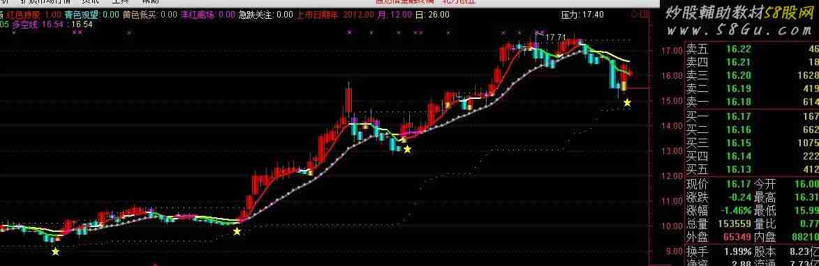 {超赢;无未来}JRH:=HHV(C,2);JRL:=LLV(C,2);MA3:=MA(CLOSE,3);YTSL:=(3*CLOSE+LOW+OPEN+HIGH)/6;VAR1:=(CLOSE>REF(CLOSE,1) AND CLOSE>REF(CLOSE,2));VAR2:=(REF(VAR1,1) AND CLOSE<=REF(CLOSE,1) AND CLOSE>=REF(CLOSE,2));VAR3:=(REF(VAR2,1) AND CLOSE>=REF(CLOSE,1) AND CLOSE<=REF(CLOSE,2));VAR4:=(REF(VAR3,1) AND CLOSE<=REF(CLOSE,1) AND CLOSE>=REF(CLOSE,2));VAR5:=(REF(VAR4,1) AND CLOSE>=REF(CLOSE,1) AND CLOSE<=REF(CLOSE,2));VAR6:=(REF(VAR5,1) AND CLOSE<=REF(CLOSE,1) AND CLOSE>=REF(CLOSE,2));VAR7:=(REF(VAR6,1) AND CLOSE>=REF(CLOSE,1) AND CLOSE<=REF(CLOSE,2));VAR8:=(REF(VAR7,1) AND CLOSE<=REF(CLOSE,1) AND CLOSE>=REF(CLOSE,2));VAR9:=(REF(VAR8,1) AND CLOSE>=REF(CLOSE,1) AND CLOSE<=REF(CLOSE,2));VARA:=(REF(VAR9,1) AND CLOSE<=REF(CLOSE,1) AND CLOSE>=REF(CLOSE,2));VARB:=(REF(VARA,1) AND CLOSE>=REF(CLOSE,1) AND CLOSE<=REF(CLOSE,2));VARC:=(REF(VARB,1) AND CLOSE<=REF(CLOSE,1) AND CLOSE>=REF(CLOSE,2));VARD:=(CLOSE<REF(CLOSE,1) AND CLOSE<REF(CLOSE,2));VARE:=(REF(VARD,1) AND CLOSE>=REF(CLOSE,1) AND CLOSE<=REF(CLOSE,2));VARF:=(REF(VARE,1) AND CLOSE<=REF(CLOSE,1) AND CLOSE>=REF(CLOSE,2));VAR10:=(REF(VARF,1) AND CLOSE>=REF(CLOSE,1) AND CLOSE<=REF(CLOSE,2));VAR11:=(REF(VAR10,1) AND CLOSE<=REF(CLOSE,1) AND CLOSE>=REF(CLOSE,2));VAR12:=(REF(VAR11,1) AND CLOSE>=REF(CLOSE,1) AND CLOSE<=REF(CLOSE,2));VAR13:=(REF(VAR12,1) AND CLOSE<=REF(CLOSE,1) AND CLOSE>=REF(CLOSE,2));VAR14:=(REF(VAR13,1) AND CLOSE>=REF(CLOSE,1) AND CLOSE<=REF(CLOSE,2));VAR15:=(REF(VAR14,1) AND CLOSE<=REF(CLOSE,1) AND CLOSE>=REF(CLOSE,2));VAR16:=(REF(VAR15,1) AND CLOSE>=REF(CLOSE,1) AND CLOSE<=REF(CLOSE,2));VAR17:=(REF(VAR16,1) AND CLOSE<=REF(CLOSE,1) AND CLOSE>=REF(CLOSE,2));VAR18:=(REF(VAR17,1) AND CLOSE>=REF(CLOSE,1) AND CLOSE<=REF(CLOSE,2));VAR19:=((REF(VARD OR VARE OR VARF OR VAR10 OR VAR11 OR VAR12 OR VAR13 OR VAR14 OR VAR15 OR VAR16 OR VAR17 OR VAR18,1)) AND VAR1);VAR1A:=((REF(VAR1 OR VAR2 OR VAR3 OR VAR4 OR VAR5 OR VAR6 OR VAR7 OR VAR8 OR VAR9 OR VARA OR VARB OR VARC,1)) AND VARD);红色持股:VAR1 OR VAR2 OR VAR3 OR VAR4 OR VAR5 OR VAR6 OR VAR7 OR VAR8 OR VAR9 OR VARA OR VARB OR VARC,COLOR0000FF,NODRAW;离场:=IF(红色持股,JRL,DRAWNULL);明离场价:=离场,COLORFF99FF,NODRAW;今离场价:=REF(离场,1)COLOR0000FF,NODRAW;青色观望:VARD OR VARE OR VARF OR VAR10 OR VAR11 OR VAR12 OR VAR13 OR VAR14 OR VAR15 OR VAR16 OR VAR17 OR VAR18,COLORFFFF00,NODRAW;进:=IF(青色观望,JRH,DRAWNULL);明进场价:=进,COLOR33AACC,NODRAW;今进场价:=REF(明进场价,1),COLORFF0000,NODRAW;黄色低买:VAR19,COLOR33AACC,NODRAW;洋红离场:VAR1A,COLORMAGENTA,NODRAW;急跌关注:(CLOSE-MA(CLOSE,34))/MA(CLOSE,34)*100<-14,COLORWHITE,NODRAW;上市日期年:REF(YEAR,BARSCOUNT(CLOSE)-1),NODRAW,COLOR0000FF;月:REF(MONTH,BARSCOUNT(CLOSE)-1),NODRAW,COLORFF00FF;日:REF(DAY,BARSCOUNT(CLOSE)-1),NODRAW,COLOR00FFFF;STICKLINE(ISLASTBAR AND (红色持股 OR REF(红色持股,1)=1),今离场价,今离场价,30,1),COLOR0000FF;STICKLINE(ISLASTBAR AND (青色观望 OR REF(青色观望,1)=1),今进场价,今进场价,30,1),COLOR00FF00;STICKLINE(C>=O,L,H,0,0),COLOR0000CC;STICKLINE(C<O,L,H,0,0),COLOR999900;STICKLINE(1,C,O,3.5,0),COLOR858500;STICKLINE(C>=O,C,O,3.5,0),COLOR0000E5;STICKLINE(红色持股,CLOSE,O,2.8,0),COLOR000055;STICKLINE(红色持股,CLOSE,O,2,0),COLOR000088;STICKLINE(红色持股,CLOSE,O,1.5,0),COLOR0000AA;STICKLINE(红色持股,CLOSE,O,1,0),COLOR0000CC;STICKLINE(红色持股,CLOSE,O,0.5,0),COLOR0000EE;STICKLINE(青色观望,CLOSE,O,2.8,0),COLOR555500;STICKLINE(青色观望,CLOSE,O,2,0),COLOR888800;STICKLINE(青色观望,CLOSE,O,1.5,0),COLORAAAA00;STICKLINE(青色观望,CLOSE,O,1,0),COLORCCCC00;STICKLINE(青色观望,CLOSE,O,0.5,0),COLOREEEE00;CO:=(C-O);STICKLINE(急跌关注,O,C-CO/2,2.8,0),COLOR555555;STICKLINE(急跌关注,O,C-CO/2,2,0),COLOR888888;STICKLINE(急跌关注,O,C-CO/2,1.5,0),COLORAAAAAA;STICKLINE(急跌关注,O,C-CO/2,1,0),COLORCCCCCC;STICKLINE(急跌关注,O,C-CO/2,0.5,0),COLOREEEEEE;STICKLINE(黄色低买,O,O+CO/3,2.8,0),COLOR335555;STICKLINE(黄色低买,O,O+CO/3,2,0),COLOR338888;STICKLINE(黄色低买,O,O+CO/3,1.5,0),COLOR33AAAA;STICKLINE(黄色低买,O,O+CO/3,1,0),COLOR33CCCC;STICKLINE(黄色低买,O,O+CO/3,0,0),COLOR33EEEE;STICKLINE(洋红离场,O,O+CO/3,2.8,0),COLOR550055;STICKLINE(洋红离场,O,O+CO/3,2,0),COLOR880088;STICKLINE(洋红离场,O,O+CO/3,1.5,0),COLORAA00AA;STICKLINE(洋红离场,O,O+CO/3,1,0),COLORCC00CC;STICKLINE(洋红离场,O,O+CO/3,0.5,0),COLOREE00EE;压力:MA(REF(HHV(C,30),1),2),POINTDOT,COLOR9DFFFF;支撑:MA(REF(LLV(C,30),1),2),POINTDOT,COLORABFF46;PMA:MA(C,5),COLORWHITE,LINETHICK2;IF(PMA>REF(PMA,1),PMA,DRAWNULL),COLORRED,LINETHICK2;IF(PMA<REF(PMA,1),PMA,DRAWNULL),COLORGREEN,LINETHICK2;X:=(3*C+L+O+H)/6;多空线:(20*X+19*REF(X,1)+18*REF(X,2)+17*REF(X,3)+16*REF(X,4)+15*REF(X,5)+14*REF(X,6)+13*REF(X,7)+12*REF(X,8)+11*REF(X,9)+10*REF(X,10)+9*REF(X,11)+8*REF(X,12)+7*REF(X,13)+6*REF(X,14)+5*REF(X,15)+4*REF(X,16)+3*REF(X,17)+2*REF(X,18)+REF(X,20))/210,COLORFF00FF,LINETHICK2;DD:=多空线<REF(多空线,1);IF(DD,多空线,DRAWNULL),COLOR00FFFF,LINETHICK2;A:=(PMA>多空线);IF(A,多空线,DRAWNULL),COLOR33FF33,POINTDOT,LINETHICK4;RSV:=(CLOSE-LLV(LOW,9))/(HHV(HIGH,9)-LLV(LOW,9))*100;K:=SMA(RSV,9,1);D:=SMA(K,9,1);J:=3*K-2*D;X2:=LLV(J,2)=LLV(J,8);Y:=IF(CROSS(J,REF(J+0.01,1)) AND X2 AND J<20,30,0);DRAWTEXT(CROSS(J,REF(J+0.01,1)) AND X2 AND J<20,LOW*0.98,'★'),COLORYELLOW; |