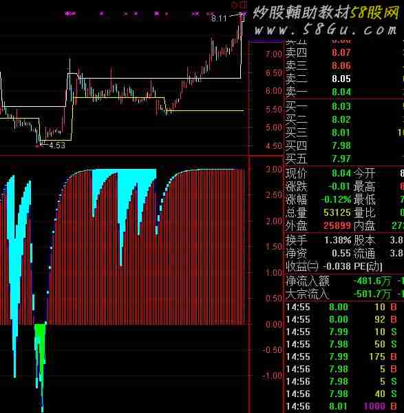 本人一直使用的操作绝技,成功率较高,收益可观!现在分享给大家! 真正的操作绝技Y1:=LLV(L,34);Y2:=SMA(ABS(L-REF(L,1)),34,1);Y3:=SMA(MAX(L-REF(L,1),0),34,2);口水:-(EMA(IF(L<=Y1,Y2/Y3,-3),9)),STICK,COLORRED,LINETHICK1;STICKLINE(口水<0,0,口水,3,0),COLOR00FF00;Y11:=LLV(L,8);Y21:=SMA(ABS(L-REF(L,1)),34,1);Y31:=SMA(MAX(L-REF(L,1),0),34,2);A:-(EMA(IF(L<=Y11,Y21/Y31,-3),9)),COLORBLUE,LINETHICK1;STICKLINE(口水>A,口水,A,3,0),COLORCYAN,LINETHICK1;