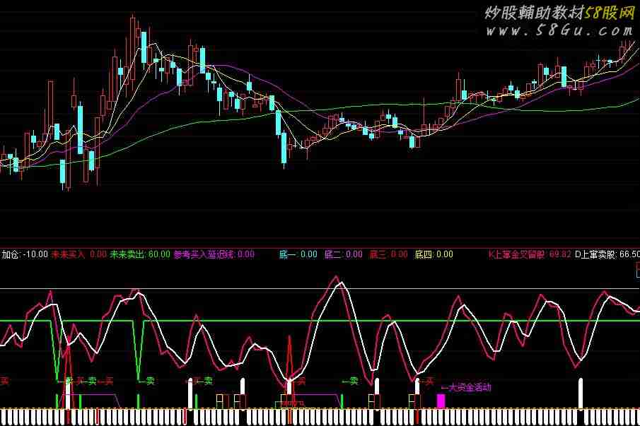 {通达信专抄底 逃顶短线王指标}V1:=MA(C,3)=HHV(MA(C,3),7);V2:=MA(C,3)>MA(C,5);LC20:=REF(CLOSE,1);RSI20:=SMA(MAX(CLOSE-LC20,0),4.1,1)/SMA(ABS(CLOSE-LC20),4.1,1)*100;STICKLINE(CROSS(RSI20,11)*1,-10,20,2,0),COLORYELLOW;VAR3A:=3;VAR2A:=3*SMA((CLOSE-LLV(LOW,27))/(HHV(HIGH,27)-LLV(LOW,27))*100,5,1)-2*SMA(SMA((CLOSE-LLV(LOW,27))/(HHV(HIGH,27)-LLV(LOW,27))*100,5,1),3,1);MTM:=C-REF(C,1);DX:=100*EMA(EMA(MTM,6),6)/EMA(EMA(ABS(MTM),6),6);YXF:=IF(LLV(DX,2)=LLV(DX,7) AND COUNT(DX<0,2) AND CROSS(DX,MA(DX,2)),1,0);加仓:IF(FILTER(YXF=1,5),20,-10),STICK,LINETHICK6;A51:=3*SMA((C-LLV(L,55))/(HHV(H,55)-LLV(L,55))*100,5,1)-2*SMA((C-LLV(L,55))/(HHV(H,55)-LLV(L,55))*100,5,1);FY:=EMA(A51,5);A54:=((C-LLV(L,21))/(HHV(H,21)-LLV(L,21)))*100;VAR2:=TROUGHBARS(3,15,1)<10;VAR3:=PEAKBARS(3,15,1)<5;VAR4:=IF(VAR2=1,50,0);VAR5:=IF(VAR3=1,50,0);底部:=IF(VAR4=50,10,0);头部:=IF(VAR5=50,20,60);未来买入:IF(底部=10 AND REF(底部,1)=10 AND REF(底部,2)=0,50,0),COLORRED,LINETHICK2;未来卖出:IF(头部=20 AND REF(头部,1)=20 AND REF(头部,2)=60,20,60),COLORGREEN,LINETHICK2;参考买入延迟线:底部,LINETHICK1 ,COLORMAGENTA;LT:=100;LU:=0;LV:=38.2;LA:=REF(CLOSE,1);LB:=((SMA(MAX((CLOSE - LA),0),5,1) / SMA(ABS((CLOSE - LA)),5,1)) * 100);LC:=(HIGH - REF(HIGH,1));LD:=(REF(LOW,1) - LOW);LE:=SUM(MAX(MAX((HIGH - LOW),ABS((HIGH - REF(CLOSE,1)))),ABS((LOW - REF(CLOSE,1)))),10);LF:=SUM(IF(((LC > 0) AND (LC > LD)),LC,0),10);LG:=SUM(IF(((LD > 0) AND (LD > LC)),LD,0),10);LH:=((LF * 100) / LE);LI:=((LG * 100) / LE);LJ:=MA(((ABS((LI - LH)) / (LI + LH)) * 100),5);AV:=(LB + LJ);LK:=((100 * (HHV(HIGH,10) - CLOSE)) / (HHV(HIGH,10) - LLV(LOW,10)));LL:=(LB - LK);LM:=(AV + LL);LO:=((((2 * CLOSE) + HIGH) + LOW) / 4);LP:=LLV(LOW,34);LQ:=HHV(HIGH,34);LR:=EMA((((LO - LP) / (LQ - LP)) * 100),13);LS:=EMA(((0.667 * REF(LR,1)) + (0.333 * LR)),2);向导线:=LLV(LM,1);STICKLINE((向导线>225),95,90,4,1),COLORFFCC00;STICKLINE((向导线>235),100,95,4,1),COLORRED;STICKLINE(CROSS(235,向导线),100,90,4,1),COLOR00FF00;STICKLINE((LM<(0-1)),0,5,4,1),COLOR00FF00;STICKLINE((LM<(0-5)),5,10,4,1),COLORYELLOW;STICKLINE(CROSS(向导线,(0-3)),0,10,4,1),COLORRED;BIAS1:=(CLOSE-MA(CLOSE,6))/MA(CLOSE,6)*100;BIAS2:=(CLOSE-MA(CLOSE,12))/MA(CLOSE,12)*100;BIAS3:=(CLOSE-MA(CLOSE,24))/MA(CLOSE,24)*100;BIAS:=(BIAS1+2*BIAS2+3*BIAS3)/6;乖离:=MA(BIAS,3);底一:IF(乖离<-12 AND 乖离>=-18,-4,0), COLORCYAN,LINETHICK1;STICKLINE(乖离<-12 AND 乖离>=-18,2,0,6,0) , COLORCYAN;底二:IF(乖离<-18,3,0),COLORFF35FF,LINETHICK1;STICKLINE(乖离<-18,3,0,6,0),COLORFF35FF;底三:IF(乖离<-6,5,0),COLORRED,LINETHICK1;STICKLINE(乖离<-6,5,3,2,1),COLORRED;底四:IF(乖离<-4.5,0,0),COLOR00FFFF,LINETHICK1;STICKLINE(乖离<-4.5,0,1,3,1),COLOR00FFFF;买:=(ZIG(3,5)>REF(ZIG(3,5),1)) AND (REF(ZIG(3,5),1)<=REF(ZIG(3,5),2)) AND (REF(ZIG(3,5),2)<=REF(ZIG(3,5),3));卖:=(ZIG(3,5)<REF(ZIG(3,5),1)) AND (REF(ZIG(3,5),1)>=REF(ZIG(3,5),2)) AND (REF(ZIG(3,5),2)>=REF(ZIG(3,5),3));STICKLINE((买=1),(-10),0,1,0),COLOR0000FF;DRAWTEXT((买=1),(19),'←买'),COLOR0000FF;STICKLINE((卖=1),10,0,1,0),COLOR00FF00;DRAWTEXT((卖=1),19,'←卖'),COLOR00FF00;VARE:=MA(100*(CLOSE-LLV(CLOSE,34))/(HHV(HIGH,34)-LLV(LOW,34)),5)-20;VARF:=100-3*SMA((CLOSE-LLV(LOW,75))/(HHV(HIGH,75)-LLV(LOW,75))*100,20,1)+2*SMA(SMA((CLOSE-LLV(LOW,75))/(HHV(HIGH,75)-LLV(LOW,75))*100,20,1),15,1);VAR10:=100-3*SMA((OPEN-LLV(LOW,75))/(HHV(HIGH,75)-LLV(LOW,75))*100,20,1)+2*SMA(SMA((OPEN-LLV(LOW,75))/(HHV(HIGH,75)-LLV(LOW,75))*100,20,1),15,1);VAR11:=VARF<REF(VAR10,1) AND VOL>REF(VOL,1) AND CLOSE>REF(CLOSE,1);DRAWTEXT(VAR11 AND COUNT(VAR11,30)=1,15,'←大资金活动'),LINETHICK1,COLORFF00FF;STICKLINE(VAR11 AND COUNT(VAR11,30)=1,1,10,5,0),COLORFF00FF;VAR12:=(HIGH+LOW+CLOSE)/3;VAR13:=(VAR12-MA(VAR12,14))/(0.015*AVEDEV(VAR12,14));VAR14:=(VAR12-MA(VAR12,70))/(0.015*AVEDEV(VAR12,70));VAR15:=IF(VAR13>=150 AND VAR13<200 AND VAR14>=150 AND VAR14<200,10,0);VAR16:=IF(VAR13<=-150 AND VAR13>-200 AND VAR14<=-150 AND VAR14>-200,-10,VAR15);VAR17:=(CLOSE-MA(CLOSE,13))/MA(CLOSE,13)*100;VAR18:=100-ABS(VAR17);VAR19:=IF(VAR18<90,VAR18,100);VAR1A:=IF(VARE>0,VARE,0);VAR1B:=IF(VAR14>=200 AND VAR13>=150,15,IF(VAR14<=-200 AND VAR13<=-150,-15,VAR16))+60;VAR1C:=VAR1A>48 AND VAR1B>60 AND VAR19<100;DRAWTEXT(VAR1C AND COUNT(VAR1C,30)=1,15,'←大笔出货'),LINETHICK1,COLORFFCC66;STICKLINE(VAR1C AND COUNT(VAR1C,30)=1,0,10,5,0),COLORFFCC66;P1:=5;P2:=4;VARA:=LLV(LOW,P1);VARB:=HHV(HIGH,P1);K上窜金叉留股: EMA((CLOSE-VARA)/(VARB-VARA)*100,P2),COLORLIMAGENTA,LINETHICK2;D上窜卖股: EMA(0.667*REF(K上窜金叉留股,1)+0.333*K上窜金叉留股,2),COLORWHITE,LINETHICK2;风险:82; |