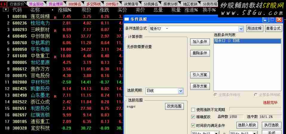 因众多小散不会改编短杀预警,本人把伏虎擒牛的条件预警指标送出,公式完全加密,不喜加密的请飘过,高手请绕行。在伏虎擒牛中明知加密又下载了指标却胡言乱语:“不知源码,不知其理”的混混,敬请远离!!!使用该指标抓牛股主升应注意:是介入在个股长期横盘突破时(未大幅拉升的个股),享受主力拉升的快乐,不可在个股顶部使用!!补上贴图,是我的短杀组合选股9.12日收盘选股效果图