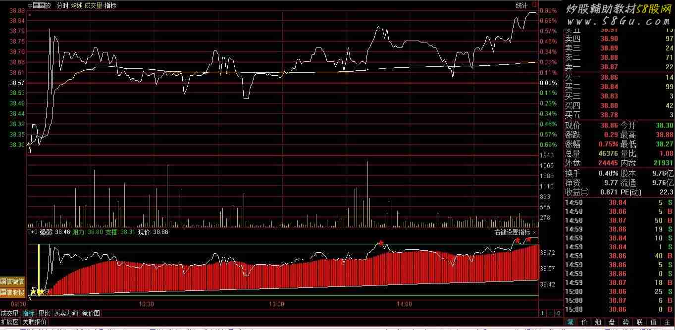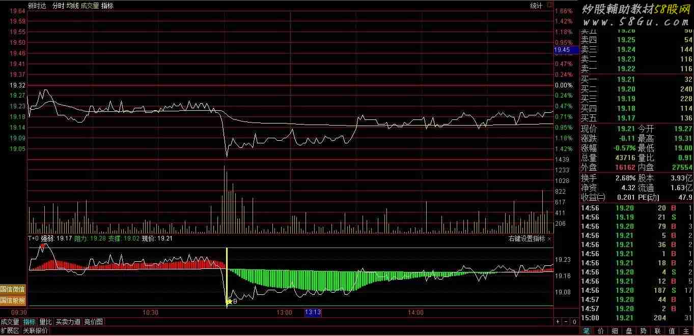 送给喜欢每天交易的同学,即使在大盘不好的情况下也可以不断增加自己的资金,即使全仓被套了,还是可以不断地降低成本滴。使用方法:分时图内添加该指标公式,出现黄色柱子及星型时买入,出现红色星型注意卖出,我平时每只股票资金分成3份,震荡期间一般用30-40%倒T+0降低持仓成本MA30:=EMA(CLOSE,30); 强弱:EMA(CLOSE,900); STICKLINE((MA30>强弱),MA30,强弱,1,0),COLOR0000FF; STICKLINE((MA30<强弱),MA30,强弱,1,0),COLOR00FF00; H1:=MAX(DYNAINFO(3),DYNAINFO(5)); L1:=MIN(DYNAINFO(3),DYNAINFO(6)); P1:=H1-L1; 阻力:L1+P1*7/8,COLOR00DD00; 支撑:L1+P1*0.5/8,COLOR00DD00; 现价:CLOSE,COLORWHITE,LINETHICK1; STICKLINE(CROSS(支撑,现价),支撑,阻力,1,0),COLORYELLOW; DRAWTEXT(LONGCROSS(支撑,现价,2),支撑*1.001,'★B'),COLORYELLOW;{吸} DRAWTEXT(LONGCROSS(现价,阻力,2),现价,'★'),COLORRED;{抛};  |