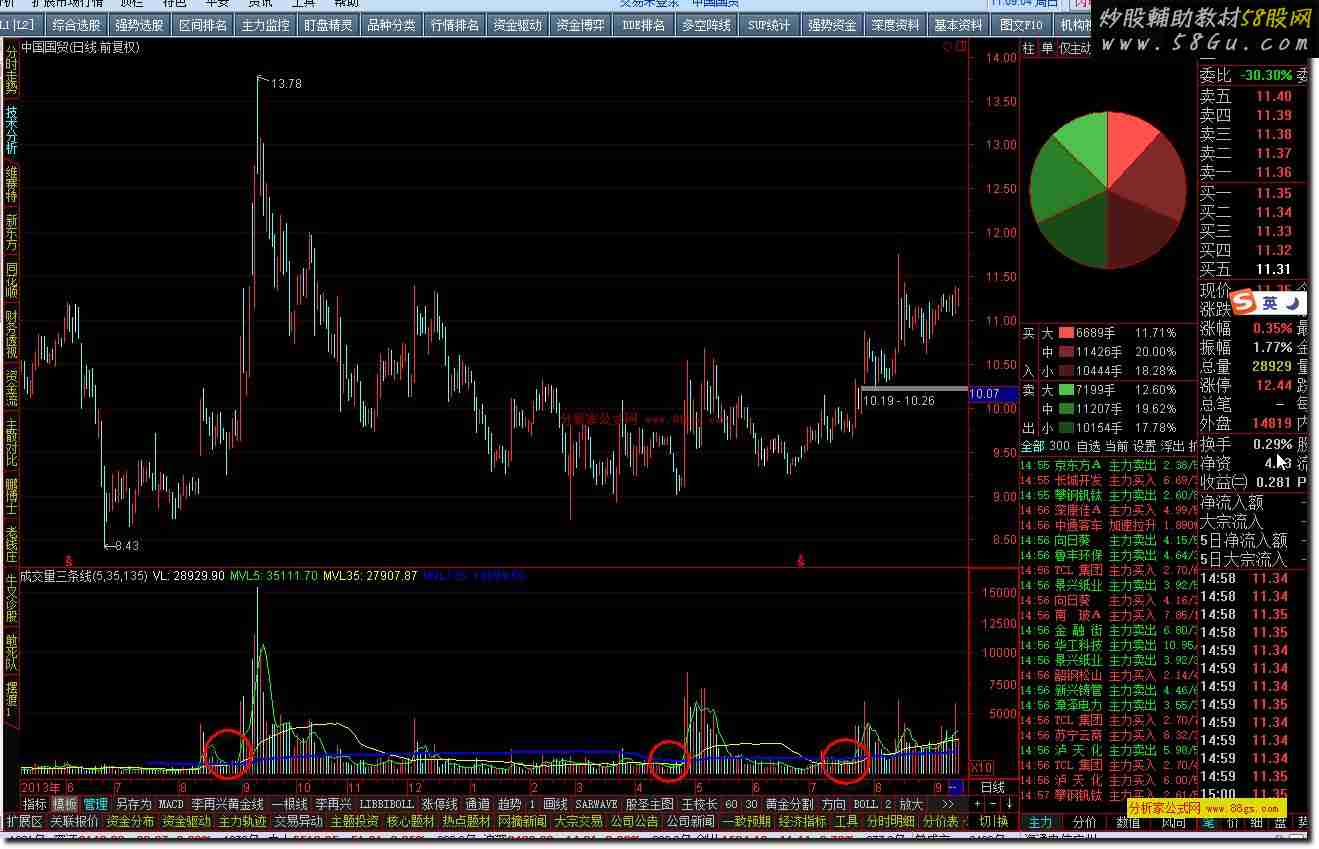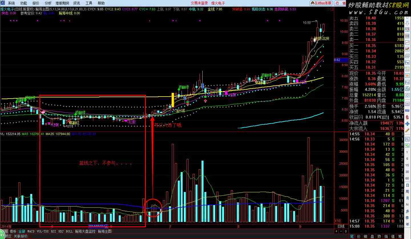 本指标非本人原创,只是我在使用过程中,感觉大道至简,简单三条线,却能给你勾画出一副中长线操作的蓝图。。。。。 指标的具体用法,大家可以自己慢慢验证,蓝线之下建议不参与。。。绿线上穿黄线,有得涨,黄线绿线在蓝线之上。。。。尽情做波段吧~~~可以用这个替代系统自带的成交量指标。。至于名字,您爱起啥名都可以~~~ 本人只抛砖引玉~~~ VL:VOL,VOLSTICK;MVL5:MA(VL,M1),COLORGREEN,LINETHICK1;MVL35:MA(VL,M2),COLORYELLOW,LINETHICK1;MVL135:MA(VL,M3),COLORBLUE,LINETHICK2;
