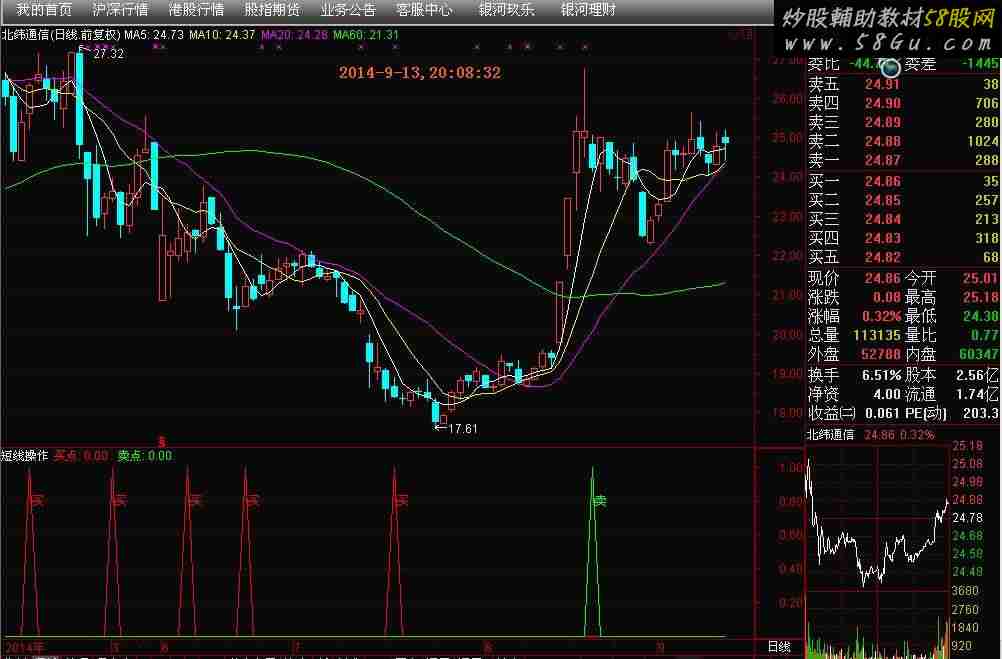 这是我长期使用的短线操作指标公式,适用于大智慧和通达信等相关系统平台。该指标特别适合于比较激进的短线操作者使用,如果严格按此指标进行操作,能够在短期内使资本收益最大化。该指标公式没有使用任何未来函数,也没有调用未来数据,信号因此不会发生任何漂移。按此公式进行操作,能够使资金象滚雪球那样越来越大,但一定要记住,是短线操作,而不是中长线操作。