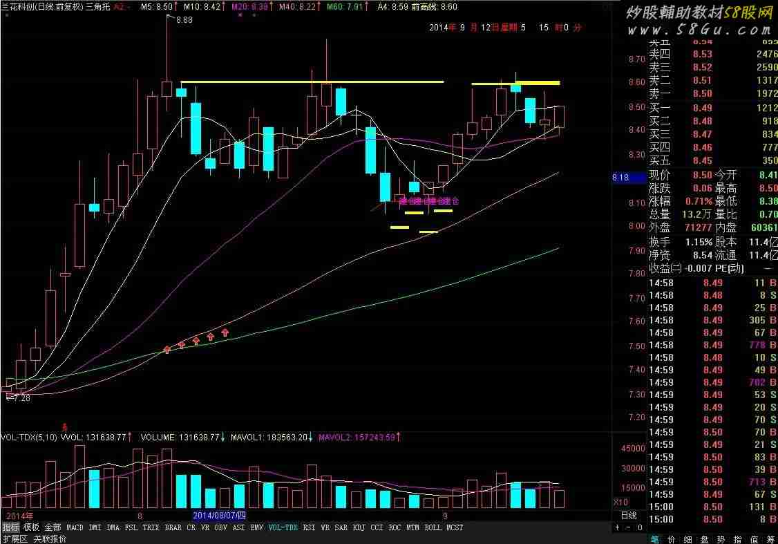 名称:时间代码 可以把时间“年月日时分星期”嵌入主图DRAWNUMBER_FIX(CURRBARSCOUNT=1,0.70,0.02,0,YEAR);DRAWTEXT_FIX(1,0.745,0.02,1,'年'),COLORRED;DRAWTEXT_FIX(1,0.78,0.02,1,'月'),COLORRED;DRAWTEXT_FIX(1,0.815,0.02,1,'日'),COLORRED;DRAWTEXT_FIX(1,0.845,0.02,1,'星期'),COLORRED;DRAWTEXT_FIX(1,0.92,0.02,1,'时'),COLORRED;DRAWTEXT_FIX(1,0.95,0.02,1,'分'),COLORRED;DRAWNUMBER_FIX(CURRBARSCOUNT=1,0.75,0.02,0,MONTH);DRAWNUMBER_FIX(CURRBARSCOUNT=1,0.785,0.02,0,DAY);DRAWNUMBER_FIX(CURRBARSCOUNT=1,0.85,0.02,0,WEEKDAY);DRAWNUMBER_FIX(CURRBARSCOUNT=1 AND FROMOPEN<121,0.88,0.02,0,INTPART((34200+FROMOPEN*60)/3600));DRAWNUMBER_FIX(CURRBARSCOUNT=1 AND FROMOPEN>120,0.88,0.02,0,INTPART((34200+FROMOPEN*60+5400)/3600));DRAWNUMBER_FIX(CURRBARSCOUNT=1 AND DYNAINFO(9)>5000 AND C>4,0.9,0.8,0,DYNAINFO(9)),COLORMAGENTA;DRAWNUMBER_FIX(CURRBARSCOUNT=1 AND FROMOPEN<121,0.92,0.02,0,60*(((34200+FROMOPEN*60)/3600)-INTPART((34200+FROMOPEN*60)/3600)));DRAWNUMBER_FIX(CURRBARSCOUNT=1 AND FROMOPEN>120,0.92,0.02,0,60*(((34200+FROMOPEN*60+5400)/3600)-INTPART((34200+FROMOPEN*60+5400)/3600)));M5:MA(C,5),COLORWHITE;M10:MA(C,10),COLORYELLOW;M20:MA(C,20),COLORMAGENTA;M40:MA(C,40),COLORLIRED;M60:MA(C,60),COLORGREEN; |