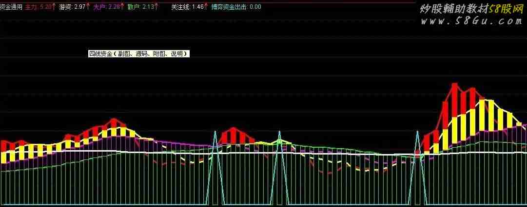 A:=V*100/CAPITAL; 主力:MA(A,4),COLORRED,LINETHICK3; 游资:MA(A,8),COLORYELLOW,LINETHICK3; 大户:MA(A,16),COLORMAGENTA,LINETHICK3; 散户:MA(A,32),COLORGREEN,LINETHICK2; STICKLINE(主力>0,0,主力,2,0),COLORRED; STICKLINE(游资>0,0,游资,2,0),COLORYELLOW; STICKLINE(大户>0,0,大户,2,1),COLORMAGENTA; STICKLINE(散户>0,0,散户,2,1),COLORGREEN; 关注线:MA(A,180),COLORWHITE,LINETHICK3; 博弈资金出击:IF(CROSS(主力,关注线) ,2,0), COLORCYAN,LINETHICK2; |