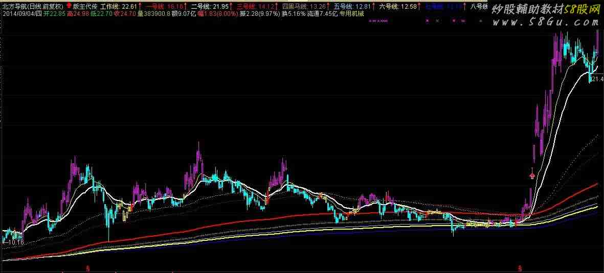工作线:EMA(C,14),COLOR00FFFF,LINETHICK1; 一号线:EMA(CLOSE,144),POINTDOT,LINETHICK2,COLOR0000FF; 二号线:EMA(C,25),COLORWHITE,LINETHICK2; 三号线:EMA(C,318),COLOR0000FF,LINETHICK2; 四黑马线:EMA(C,453),CIRCLEDOT,LINETHICK1,COLOR428899; 五号线:EMA(C,550),COLORFFCC66; 六号线:EMA(C,610),LINETHICK2,COLORYELLOW; 七号线:EMA(C,730),COLORBLUE; 八号线:EMA(C,99),POINTDOT,LINETHICK2,COLORWHITE; DIFF:=( EMA(CLOSE,7) - EMA(CLOSE,19)),COLORWHITE; DEA:=EMA(DIFF,9),COLORF00FF0 ; MACD:=0.90*(DIFF-DEA), COLORSTICK; TJ:=(DIFF>=DEA); TJ1:=(DIFF>=0); {STICKLINE(TJ,H,L,0,0),COLORYELLOW;} STICKLINE(TJ,O,C,3,1),COLORYELLOW; STICKLINE(TJ1 AND TJ,H,L,0,0),COLORF00FF0; STICKLINE(TJ1 AND TJ,O,C,3,1),COLORF00FF0; STICKLINE(DIFF=0.03) OR (CROSS(SK,SD) AND SK<=-0.14 ) OR (CROSS(SK,SD) AND SK<=0.05 AND (V/MA(V,5)>2 OR C/REF(C,1)>0.035)) ,L*0.99,'短线'),COLORRED;} {STICKLINE((CROSS(SK,SD) AND SK<-0.04 AND (C-REF(C,1))/REF(C,1)>=0.03) OR (CROSS(SK,SD) AND SK<=-0.14 ) OR (CROSS(SK,SD) AND SK<=0.05 AND (V/MA(V,5)>2 OR C/REF(C,1)>0.035)),H,L,0,0),COLORRED;} STICKLINE((CROSS(SK,SD) AND SK<-0.04 AND (C-REF(C,1))/REF(C,1)>=0.03) OR (CROSS(SK,SD) AND SK<=-0.14 ) OR (CROSS(SK,SD) AND SK<=0.05 AND (V/MA(V,5)>2 OR C/REF(C,1)>0.035)),O,C,3,0),COLORRED; SS:=CROSS(二号线,八号线) AND C>1.5 AND C>REF(C,1.5) AND C/REF(C,1.5)>=0.98 OR CROSS(二号线,三号线) AND C>1.5 AND C>REF(C,1.5) AND C/REF(C,1.5)>=0.98 OR CROSS(二号线,一号线) AND C>1.5 AND C>REF(C,1.5) AND C/REF(C,1.5)>=0.98 AND CROSS(二号线,三号线); DRAWICON(SS,L-0.04,1); DD:=CROSS(八号线,一号线) AND C>1.5 AND C>REF(C,1.5) AND C/REF(C,1.5)>=0.98 OR CROSS(八号线,四黑马线) AND C>1.5 AND C>REF(C,1.5) AND C/REF(C,1.5)>=0.98 OR CROSS(八号线,三号线) AND C>1.5 AND C>REF(C,1.5) AND C/REF(C,1.5)>=0.98 OR CROSS(八号线,三号线) AND C>1.5 AND C>REF(C,1.5) AND C/REF(C,1.5)>=0.98 AND CROSS(二号线,四黑马线); {DD:=CROSS(二号线,四黑马线);};