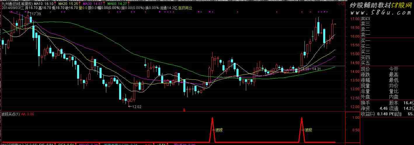 波段买点,出信号买入。信号筛选要参考形态与MACD、KDJ的情形。用好了可以抓到牛股。
