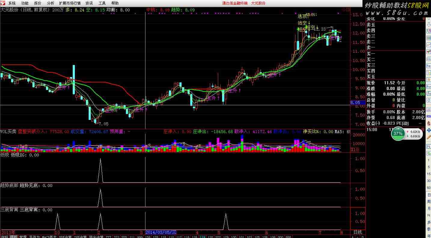 使用方法: 1、三个附图指标:三个指标在底部同时出现:可买入,最好是三底信号出现后然后经过反复打底在买。 2、选股指标很简单,把三个指标合并一下就行了 3、此指标是做中线的,要摆几个月的低吸RSV4:=(CLOSE-LLV(LOW,36))/(HHV(HIGH,36)-LLV(LOW,36))*100;RSV5:=MA((LLV(LOW,45)-CLOSE)/(HHV(HIGH,45)-LLV(LOW,45))*100,5);K4:=SMA(RSV4,3,1);D4:=SMA(K4,3,1);J4:=3*K4-2*D4;CK4:=MA(K4,15);CD4:=MA(D4,15);CJ4:=MA(J4,15);JJ1:=CJ4>REF(CJ4,1);低吸XG:CROSS(-5,RSV5) AND JJ1;趋势底部趋势:=3*SMA((CLOSE-LLV(LOW,27))/(HHV(HIGH,27)-LLV(LOW,27))*100,5,1)-2*SMA(SMA((CLOSE-LLV(LOW,27))/(HHV(HIGH,27)-LLV(LOW,27))*100,5,1),3,1);见底:=10;短期底部:=CROSS(趋势,见底);RR8:=MA(CLOSE,27);RR9:=(CLOSE-RR8)/RR8*100;RRA:=MA(RR9,2);RRB:=BARSLAST(CROSS(-10,RRA)=1);RRD:=RRA<-10 AND RRB>3;趋势见底:RRD AND 短期底部;三底背离DIFF:=EMA(CLOSE,12) - EMA(CLOSE,26); DEA:=EMA(DIFF,9); A1:=BARSLAST(REF(CROSS(DIFF,DEA),1)); B1:=REF(C,A1+1)>C AND REF(DIFF,A1+1)<DIFF AND CROSS(DIFF,DEA); A2:=BARSLAST(REF(CROSS("KDJ.K"(9,3,3),"KDJ.D"(9,3,3)),1)); B2:=REF(C,A2+1)>C AND REF("KDJ.K"(9,3,3),A2+1)<"KDJ.K"(9,3,3) AND CROSS("KDJ.K"(9,3,3),"KDJ.D"(9,3,3)); A3:=BARSLAST(REF(CROSS("RSI.RSI1"(6,12,24),"RSI.RSI2"(6,12,24)),1)); B3:=REF(C,A3+1)>C AND REF("RSI.RSI1"(6,12,24),A3+1)<"RSI.RSI1"(6,12,24) AND CROSS("RSI.RSI1"(6,12,24),"RSI.RSI2"(6,12,24)); 三底背离:B1>0 OR B2>0 OR B3>0;UploadPic/2014-9/2014911551858971.png |