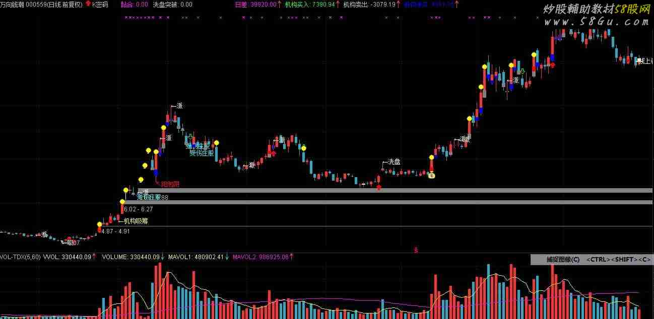 当K线在高位或者低位,出现的阳线、阴线及阳量线、阴量线!一般的理解是阳线、阳量线上涨!阴线、阴量线是下跌!但在这阳线、阴线及阳量线、阴量线背后是机构资金故意做盘!以掩盖自己的真实意图!本主图是根据当天内外盘以及主力资金进入流出进行计算及时在K线处做出提示!已方便看盘、复盘对主力意图作出自己的判断。。。。。。!半色K柱表示换手大小:5<灰色<8,8<蓝色<15,15<淡红色<25,绿色>25,红色倍量,白色地量!黄点表示当天的龙虎榜单异动!高位、低位K线中的蓝色、黄色细条表示主力派发和吸筹!
