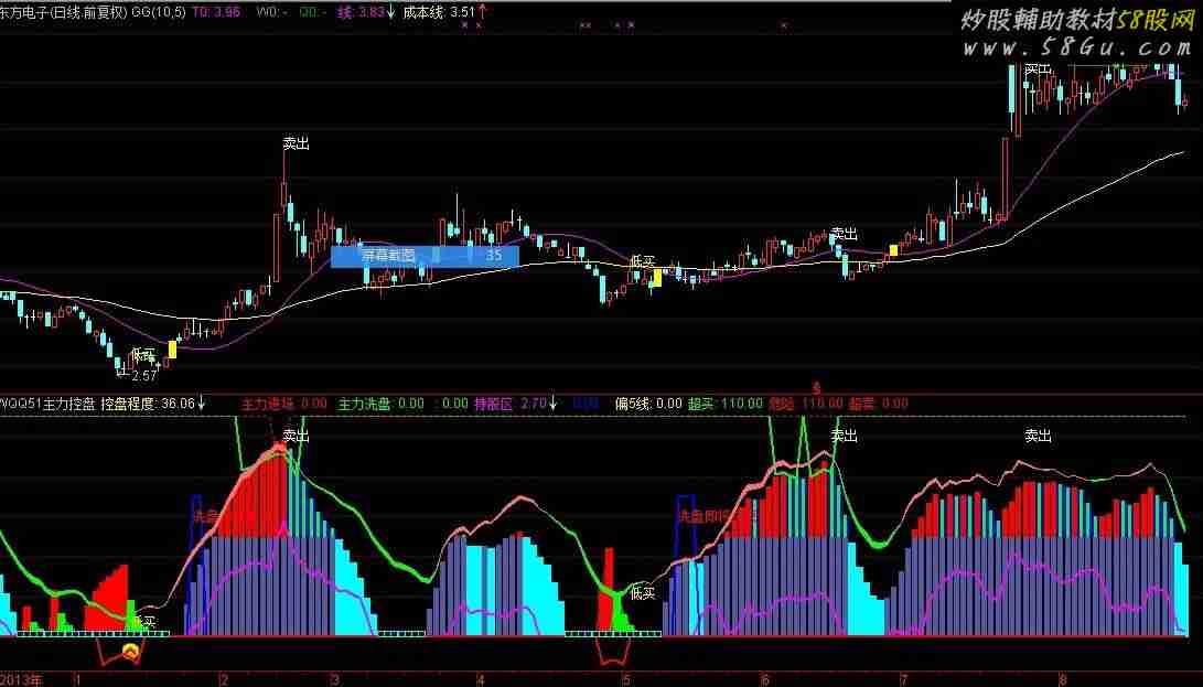 说明:这个“主力控盘”指标不是本人的原创,是从网上下载的,也不知是那位前辈的原创,本人用此指标在实战中频频获利,为感谢股友的支持,现将最新优化的“主力控盘”指标与大家分享用法:灰色柱开始出现---表现为主力开始控盘,红色柱50以上--表现为主力高度控盘,兰柱青色芯---主力开始减仓即派发,这时不要贪,与主力采取同步操作获利了结。青色柱阶段--持币休息。特别是图中下方出现青色小方格时,更要耐心持币等待进场机会的到来!优化后的“主力控盘”指标,增加了--主力进场--主力洗盘--持股区--超买--超卖--低买--卖出等参考判断!请与MACD--VOL--DMI配合使用,效果更佳!!!也希望股友能把你优化的“主力控盘”指标拿来大家分享,共同发财哟! {主力控盘优化版}