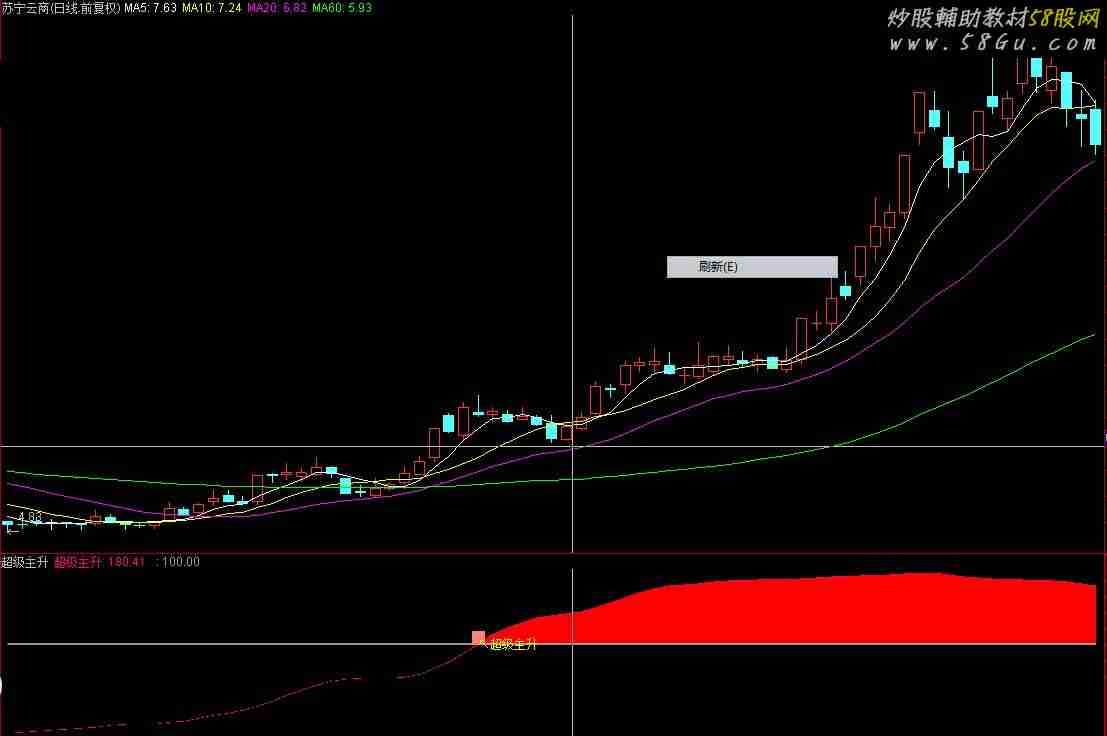 【指标用法】:主升突破(红色线)穿越100,一般都是牛股起涨点,是牛股都跑不了 这指标号称在网上卖到9999元,挺牛的指标,为了广大股民朋友利益着想,免费送与大家,喜欢就多关注。指标还有改进的地方,自己想了 VAR11:=3*SMA((C-LLV(L,180))/(HHV(H,180)-LLV(L,180))*100,5,1)-2*SMA(SMA((C-LLV(L,180))/(HHV(H,180)-LLV(L,180))*100,180,1),15,1);超级主升:EMA(VAR11,5), LINETHICK2,COLOR6600FF;DRAWBAND(超级主升,255,100,0);100,LINETHICK2 ,COLOR999999;STICKLINE(CROSS(超级主升,100),100,120,3,0),COLORLIRED;DRAWTEXT(CROSS(超级主升,100),100,'↖超级主升'),COLORYELLOW;