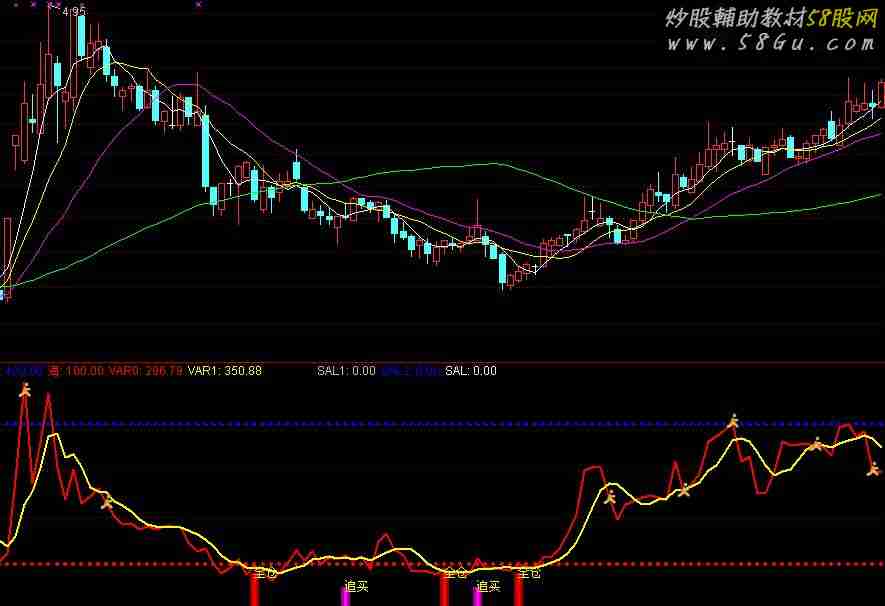 N:=21; M:=5; 天:400,POINTDOT,COLORBLUE,LINETHICK4; 海:100,POINTDOT,COLORRED,LINETHICK4; TH:=SUM(IF(CLOSE>REF(CLOSE,1),VOL,0),N); TL:=SUM(IF(CLOSE<REF(CLOSE,1),VOL,0),N); TQ:=SUM(IF(CLOSE=REF(CLOSE,1),VOL,0),N); VAR0:100*(TH*2+TQ)/(TL*2+TQ),COLOR0000FF,LINETHICK2; VAR1:MA(VAR0,M),COLOR00FFFF,LINETHICK2; {DRAWBAND(VAR0,RGB(255,0,0),VAR1,RGB(0,0,220));} W:=CROSS(VAR0,VAR1); WL1:=VAR1<100; WL2:=VAR1<150 AND VAR1>REF(VAR1,1); WLT1:=W AND WL1; WLT2:=W AND WL2; TJ1:=FILTER(WLT1,5); TJ2:=FILTER(WLT2,8); STICKLINE(TJ1,0,80,4,0),COLOR000099; STICKLINE(TJ1,0,80,2,0),COLOR0000BB; STICKLINE(TJ1,0,80,1,0),COLOR0000DD; STICKLINE(TJ1,0,80,0.3,0),COLOR0000FF; DRAWTEXT(TJ1,83,'全仓'),COLOR00FFFF; STICKLINE(TJ2,0,50,4,0),COLOR990099; STICKLINE(TJ2,0,50,2,0),COLORBB00BB; STICKLINE(TJ2,0,50,1,0),COLORDD00DD; STICKLINE(TJ2,0,50,0.3,0),COLORFF00FF; DRAWTEXT(TJ2,53,'追买'),COLOR00FFFF; SAL1:CROSS(VAR1,VAR0) AND VAR1>250; SAL2:VAR0>400; SAL:FILTER(SAL1 OR SAL2,5); DRAWICON(SAL,VAR0,15);DRAWTEXT_FIX(C>O,0.01,0.9,0,'WWW.CXH99.COM'),COLORRED; DRAWTEXT_FIX(C>O,1,1,0,'<***>'),COLORRED; |