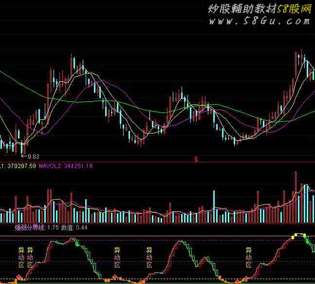 一个非常适用的逃顶指标,大盘涨了这么多了,准备随时逃VAR2:=LLV(LOW,10);VAR3:=HHV(HIGH,25);阶段卖出:=3.2,COLORCYAN;STICKLINE(C>0,3.2,3.2,1,1),COLORFF1199;清仓卖出: 3.5,COLOR0088FF;动力线:= EMA((CLOSE-VAR2)/(VAR3-VAR2)*4,4);STICKLINE(动力线>REF(动力线,1) ,动力线 ,REF(动力线,1),2 ,1),COLORRED;STICKLINE(动力线<=REF(动力线,1) ,动力线 ,REF(动力线,1),2 ,1),COLORGREEN;底部介入:0.2,COLORGREEN;重点关注:=0.5,COLOR0FFFFF;STICKLINE(C>0,0.50,0.50,1,1),COLOR1AFFFF;DRAWICON( FILTER(CROSS(动力线,重点关注),20),动力线+0.02 ,1);DRAWICON( FILTER(CROSS(清仓卖出,动力线),20),动力线+0.02,2);DRAWICON( FILTER(CROSS(动力线,底部介入),20),动力线+0.02 ,1);DRAWICON( FILTER(CROSS(阶段卖出,动力线),20),动力线+0.02,2);强弱分界线:1.75,POINTDOT,LINETHICK2,COLORFF80FF;数值:动力线,COLORA8A8A8;STICKLINE(动力线>REF(动力线,1) AND 动力线>3.49.8 ,动力线 ,REF(动力线,1),2.5,0),COLOR1EFFFF;STICKLINE(动力线<=REF(动力线,1) AND REF(动力线,1)>3.49.8 ,动力线 ,REF(动力线,1),2.5,0),COLOR1EFFFF;STICKLINE(动力线<0.5,动力线 ,REF(动力线,1),2.5,0),COLOR0080FF;STICKLINE(动力线<=REF(动力线,1) AND REF(动力线,1)<0.5 ,动力线 ,REF(动力线,1),2.5,0),COLOR0080FF;DRAWTEXT(CROSS(数值,0.50),2.5,'异'),COLORYELLOW;DRAWTEXT(CROSS(数值,0.50),2,'动'),COLORB47DFF;DRAWTEXT(CROSS(数值,0.50),1.5,'区'),COLOR00C0FF; |
