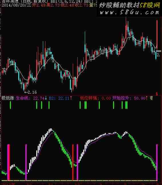 发一个精准的极低涨;VA1:=HHV(HIGH,9)-LLV(LOW,9); VA2:=HHV(HIGH,9)-CLOSE;VA3:=CLOSE-LLV(LOW,9);VA4:=VA2/VA1*100-70;VA5:=(CLOSE-LLV(LOW,60))/(HHV(HIGH,60)-LLV(LOW,60))*100;VA6:=(2*CLOSE+HIGH+LOW)/4;VA7:=SMA(VA3/VA1*100,3,1);VA8:=LLV(LOW,34);VA9:=SMA(VA7,3,1)-SMA(VA4,9,1);VARA:=IF(VA9>100,VA9-100,0);VARB:=HHV(HIGH,34);VARC:=EMA((VA6-VA8)/(VARB-VA8)*100,13);VARD:=EMA(0.667*REF(VARC,1)+0.333*VARC,2);VARE:=SMA(MAX(CLOSE-REF(CLOSE,1),0)/CLOSE,8,1)/SMA(ABS(INDEXC-REF(INDEXC,1))/INDEXC,8,1)*100-25;VARF:=MA(VARE,3);生命线:EMA(VARD,1), COLORFF00FF;VAR1:=HHV(HIGH,9)-LLV(LOW,9);VAR2:=HHV(HIGH,9)-CLOSE;VAR3:=CLOSE-LLV(LOW,9);VAR4:=((VAR2)/(VAR1))*(100)-70;VAR5:=((CLOSE-LLV(LOW,60))/(HHV(HIGH,60)-LLV(LOW,60)))*(100);VAR6:=((2)*(CLOSE)+HIGH+LOW)/(4);VAR7:=SMA(((VAR3)/(VAR1))*(100),3,1);VAR8:=LLV(LOW,34);VAR9:=SMA(VAR7,3,1)-SMA(VAR4,9,1);VAR10:=IF((VAR9>100),VAR9-100,0);VAR11:=HHV(HIGH,34);B1:=EMA(((VAR6-VAR8)/(VAR11-VAR8))*(100),8);B2:EMA(B1,5),COLORFF7000;STICKLINE(B1-B2>0,B1,B2,2,0),COLORFFFFFF;STICKLINE(B1-B2<0,B1,B2,2,0),COLOR00FF00;V1:=MA(C,5)=HHV(MA(C,5),20);V2:=MA(C,5)>MA(C,10);V3:=MA(V,5)>MA(V,40)*1.01;V4:=COUNT(MA(C,1)>REF(C,1),2)=2;VV:=V1 AND V2 AND V3 AND V4;STICKLINE(V1 AND V2 AND V3 AND V4,100,110,2,0),COLOR00FF00;A1:=EMA(CLOSE,8);A2:=EMA(A1,20);A3:=CROSS(A1,A2);A4:=A1<EMA(CLOSE,120);STICKLINE(A3 AND A4,100,110,2,0),COLOR00FF00;A5:=3*SMA((CLOSE-LLV(LOW,18))/(HHV(HIGH,18)-LLV(LOW,18))*100,21,1)-2*SMA(SMA((CLOSE-LLV(LOW,18))/(HHV(HIGH,18)-LLV(LOW,18))*100,20,1),8,1);安全位:=20;低位转强:IF(CROSS(A5,安全位),50,0),COLORRED,STICK,LINETHICK4;开始拉升:IF(CROSS(VARC,生命线) AND VARC>VARD AND VARC<55 AND C>O,50,0),COLORFF00FF,STICK,LINETHICK4;A6:=LLV(C,500)=LLV(C,5) AND C/REF(C,1)>(1+9.8/100);极低涨:IF(A6,50,0),COLORYELLOW,STICK,LINETHICK4; |