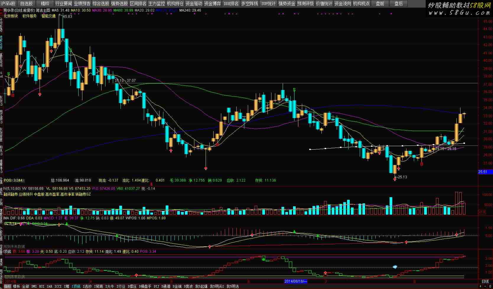 MA5:MA(CLOSE,5); MA10:MA(CLOSE,10); MA30:MA(CLOSE,30); MA60:MA(CLOSE,60); MA20:MA(CLOSE,24),NODRAW; MA120:MA(CLOSE,120); MA240:MA(CLOSE,240);{卖出------------------------} VAR55:=EMA(EMA(EMA(CLOSE,8),13),62); VAR56:=((REF(HIGH,1) + REF(LOW,1)) / 2); VAR57:=(MA(CLOSE,20) + (2 * STD(CLOSE,20))); VAR58:=((SMA(MAX((CLOSE - REF(CLOSE,1)),0),7,1) / SMA(ABS((CLOSE - REF(CLOSE,1))),7,1)) * 100); 卖出1:=FILTER(CROSS(79,VAR58),4); MA21:=REF(CLOSE,1); AZX:=((SMA(MAX((CLOSE - MA21),0),6,1) / SMA(ABS((CLOSE - MA21)),6,1)) * 100); 卖出2:=CROSS(84,AZX),COLORFF00FF; 卖出3:=CROSS(90,RSI); 卖出:=卖出1 OR 卖出2 OR 卖出3;{买入------------------------} QQ2:=(CLOSE-LLV(LOW, 18))/(HHV(HIGH, 18)-LLV(LOW, 18))*100; QQ3:=SMA(QQ2, 9, 1); QQ4:=SMA(QQ3, 3, 1); 长趋势:=3*QQ3-2*QQ4; 趋势线:=EMA(QQ3, 3); 金叉:= CROSS(长趋势,趋势线); AAAA1:=AMOUNT/V; BBB1:=L<AAAA1*0.9; CCC1:=(C-REF(C,1))/REF(C,1)*100>1.2; DDD1:=L<MA(C,5)*0.921; EEE1:=V<MA(V,5)*1.5; 老鼠仓:=BBB1 AND CCC1 AND DDD1 AND EEE1; X1:=(C+L+H)/3; BB5:=ATAN(EMA(X1,7)-REF(EMA(X1,7),1))*3.1416*10; VAR1:=(MA(CLOSE,80)-MA(CLOSE,13)/3); VAR2:=( MA((CLOSE-VAR1)/VAR1,1)); VVAR3:=(CLOSE-LLV(LOW,28))/(HHV(HIGH,28)-LLV(LOW,28))*100; VVAR4:=SMA(VVAR3,4,1); MMA:=EMA(VAR2,12)*0.7; MMB:=EMA(VAR2,3); 快到底:=IF(LLV(MMB-MMA,12)>0,0,-20); DIFF:=( EMA(CLOSE,12) - EMA(CLOSE,26))*100; DEA:=EMA(DIFF,9); MACD:= 2*(DIFF-DEA); 抄底:=IF(快到底<0 AND CROSS(MACD,0) AND VVAR4<18,1,0); AVAR2:=(2*CLOSE+HIGH+LOW)/4; AVAR3:=IF(YEAR>=2099 AND MONTH>2,0,1); AVAR4:=LLV(LOW,5); AVAR5:=HHV(HIGH,4); 散户:= EMA((AVAR2-AVAR4)/(AVAR5-AVAR4)*100,4)*AVAR3; 庄家:= EMA(0.667*REF(散户,1)+0.333*散户,2)*AVAR3; 试买:=(((CROSS(散户,庄家) AND 散户<50 AND 29<散户)) NOT 大雪) OR (CROSS(散户,庄家) AND 散户<30 ) OR 抄底; AA05:=MA(C,5); 五日乖离率:=(C-AA05)/AA05*100; BB05:=ATAN((AA05/REF(AA05,1)-1)*100)*180/3.1416; 速度5:=SMA(EMA((AA05-REF(AA05,1))/REF(AA05,1),3)*100,3,1); 加速度5:=EMA((速度5-REF(速度5,1)),3); AA10:=MA(C,10); AA20:=MA(C,20);BB10:=ATAN((AA10/REF(AA10,1)-1)*100)*180/3.1416; AA30:=MA(C,30);DRAWICON(老鼠仓 OR 金叉,(LOW - (LOW * 0.01)),1); DRAWICON(卖出,(HIGH * 1.002),2);买线:=EMA(C,4); 卖线:=EMA(SLOPE(C,20)*10+C,35); DRAWICON(CROSS(买线,卖线),(LOW - (LOW * 0.01)),7); DRAWICON(CROSS(卖线,买线),(HIGH * 1.002),8);STICKLINE(C>=O,H,C,0,0),COLOR225588; STICKLINE(C>=O,H,C,0,0),COLOR66CCFF; STICKLINE(C>=O,O,L,0,0),COLOR225588; STICKLINE(C>=O,O,L,0,0),COLOR66CCFF; STICKLINE(C>O,C,O,3.4,0),COLOR225588; STICKLINE(C>O,C,O,3.0,0),COLOR226699; STICKLINE(C>O,C,O,2.4,0),COLOR3377AA; STICKLINE(C>O,C,O,2.0,0),COLOR3388BB; STICKLINE(C>O,C,O,1.6,0),COLOR4499CC; STICKLINE(C>O,C,O,1.2,0),COLOR44AADD; STICKLINE(C>O,C,O,0.6,0),COLOR55BBEE; STICKLINE(C>O,C,O,0.1,0),COLOR66CCFF; STICKLINE(C<=O,H,C,0,0),COLOR888800; STICKLINE(C<=O,H,C,0,0),COLORFFFF00; STICKLINE(C<=O,O,L,0,0),COLOR888800; STICKLINE(C<=O,O,L,0,0),COLORFFFF00; STICKLINE(C<=O,C,O,3.4,0),COLOR888800; STICKLINE(C<=O,C,O,3.0,0),COLOR999900; STICKLINE(C<=O,C,O,2.4,0),COLORAAAA00; STICKLINE(C<=O,C,O,2.0,0),COLORBBBB00; STICKLINE(C<=O,C,O,1.6,0),COLORCCCC00; STICKLINE(C<=O,C,O,1.2,0),COLORDDDD00; STICKLINE(C<=O,C,O,0.6,0),COLOREEEE00; STICKLINE(C<=O,C,O,0.1,0),COLORFFFF00;DRAWTEXT_FIX(1,0.00,0,0,DYBLOCK),COLORYELLOW; DRAWTEXT_FIX(1,0.04,0,0,HYBLOCK),COLORYELLOW; DRAWTEXT_FIX(1,0.08,0,0,GNBLOCK),COLORYELLOW;DRAWTEXT_FIX(1,0.10,100,0,'总:'),COLORWHITE;{总市值} DRAWNUMBER_FIX(1,0.11,100,0,CONST(FINANCE(41)/100000000)),COLORWHITE; DRAWTEXT_FIX(1,0.15,100,0,'流:'),COLORWHITE;{流通市值} DRAWNUMBER_FIX(1,0.16,100,0,CONST(FINANCE(40)/100000000)),COLORWHITE;DRAWTEXT_FIX(1,0.20,100,0,'现流:'),COLOR00FFFF;{经营性现金流} DRAWNUMBER_FIX(1,0.22,100,0,CONST(FINANCE(25)/1000000000)),COLOR00FFFF; DRAWTEXT_FIX(1,0.25,100,0,'流比:'),COLOR00FFFF;{流动比率值>1.5<2.5较为合理,低于1说明偿债能力欠佳。} DRAWNUMBER_FIX(1,0.27,100,0,CONST(FINANCE(11)/FINANCE(15))),COLOR00FFFF; DRAWTEXT_FIX(1,0.29,100,0,'速比:'),COLOR00FFFF;{速动比率} DRAWNUMBER_FIX(1,0.32,100,0,CONST((FINANCE(11)-FINANCE(27))/FINANCE(15))),COLOR00FFFF;DRAWTEXT_FIX(1,0.35,100,0,'毛:'),COLORGREEN;{毛利率} DRAWNUMBER_FIX(1,0.36,100,0,CONST((FINANCE(20)-FINANCE(21))/FINANCE(20)*100)),COLORGREEN; DRAWTEXT_FIX(1,0.39,100,0,'净:'),COLORGREEN;{净利率} DRAWNUMBER_FIX(1,0.40,100,0,CONST(FINANCE(30)/FINANCE(20)*100)),COLORGREEN; DRAWTEXT_FIX(1,0.43,100,0,'销:'),COLORGREEN;{市销率} DRAWNUMBER_FIX(1,0.44,100,0,CONST(FINANCE(20)/FINANCE(1))),COLORGREEN; DRAWTEXT_FIX(1,0.47,100,0,'应收:'),COLORGREEN; DRAWNUMBER_FIX(1,0.49,100,0,CONST(FINANCE(22)/100000000)),COLORGREEN; DRAWTEXT_FIX(1,0.53,100,0,'存货:'),COLORGREEN; DRAWNUMBER_FIX(1,0.55,100,0,CONST(FINANCE(27)/100000000)),COLORGREEN;