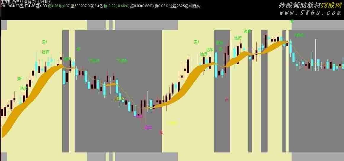 {背景长线} UR:=10;LR:=10; TC1:=IF(H=HHV(H,8*UR),H,DRAWNULL); TC2:=CONST(BARSLAST(TC1=H))+1; UPPER:=CONST(IF(TC2=1,H,REF(H,TC2-1))); BC1:=IF(L=LLV(L,8*LR),L,DRAWNULL); BC2:=CONST(BARSLAST(BC1=L))+1; LOWER:=CONST(IF(BC2=1,L,REF(L,BC2-1)));A:=EMA((LOW+CLOSE+OPEN)/3,28); B:=REF(EMA((LOW+CLOSE+OPEN)/3,28),1);N:=IF(BARSCOUNT(C)>=45,45,BARSCOUNT(C)); D:=C>=MA(C,N); E:=C<MA(C,N);上线:=SMA(C,6.5,1); 下线:=SMA(C,13.5,1); 上线1:=SMA(C,3,1); 下线1:=SMA(C,8,1); {} STICKLINE( A>B OR D>0 OR 上线>下线,UPPER*1.01,LOWER*0.99,4.2,0),COLORADEAEA; STICKLINE( A<B OR E>0 OR 下线>上线,UPPER*1.01,LOWER*0.99,4.2,0),COLORA8A8A8;{背景中线} AA10:=MA(CLOSE,8); AA12:=MA(CLOSE,12); BB10:=((ATAN((AA10 - REF(AA10,1))) * 3.1416) * 10); BB12:=((ATAN((AA12 - REF(AA12,1))) * 3.1416) * 10);JJ:=(CLOSE+HIGH+LOW)/3; A1:=EMA(JJ,10); B1:=REF(A1,1);A0:=(L+H+C*2)/4; A111:=EMA(A0,14),LINETHICK2; A211:=EMA(A0,25),LINETHICK2; A1X:=(A111-REF(A111,1))/REF(A111,1)*100,NODRAW; A2X:=(A211-REF(A211,1))/REF(A211,1)*100,NODRAW; 看多:=IF(A1X>=0 AND BARSLAST(CROSS(A1X,0))>0,REF((C+O)/2,BARSLAST(CROSS(A1X,0))),DRAWNULL); 逃顶:=IF(A1X<0 AND BARSLAST(CROSS(0,A1X))>0,REF((C+O)/2,BARSLAST(CROSS(0,A1X))),DRAWNULL);AF:=EMA((CLOSE+HIGH+LOW)/3,10);BF:=IF (YEAR<=2017,IF(YEAR<2017,REF(AF,1),IF(YEAR=2017 AND MONTH<10,REF(AF,1),0)),0); {}STICKLINE(A1>B1 OR AA10>AA12 OR A1X>=0 OR AF>BF ,UPPER,LOWER,4.2,0),COLORADEAEA; STICKLINE(A1<B1 OR AA10<AA12 OR (A1X<0 AND A2X<0) OR AF<BF ,UPPER,LOWER,4.2,0),COLORGRAY;{};DRAWKLINE(H,O,L,C); { MA3:=MA(CLOSE,3); YTSL:=(3*CLOSE+LOW+OPEN+HIGH)/6; 辰星线:=(20*YTSL+19*REF(YTSL,1)+18*REF(YTSL,2)+17*REF(YTSL,3)+16*REF(YTSL,4)+15*REF(YTSL,5)+14*REF(YTSL,6)+13*REF(YTSL,7)+12*REF(YTSL,8)+11*REF(YTSL,9)+10*REF(YTSL,10)+9*REF(YTSL,11)+8*REF(YTSL,12)+7*REF(YTSL,13)+6*REF(YTSL,14)+5*REF(YTSL,15)+4*REF(YTSL,16)+3*REF(YTSL,17)+2*REF(YTSL,18)+REF(YTSL,20))/211,COLOR0000FF; 牵牛线:=MA(CLOSE,26),COLORFF00FF; 等待:=IF(MA3>辰星线,辰星线,MA3); IF(等待>REF(等待,1),等待,DRAWNULL),LINETHICK2,COLOR0000FF; IF(辰星线>REF(辰星线,1),辰星线,DRAWNULL),LINETHICK2,COLOR0000FF;}{1}{ AA05:MA(C,5),LINETHICK3,COLOR00CCFF; 五日乖离率:=(C-AA05)/AA05*100; BB051:=ATAN((AA05/REF(AA05,1)-1)*100)*180/3.1416; 速度5:=SMA(EMA((AA05-REF(AA05,1))/REF(AA05,1),3)*100,3,1); 加速度5:EMA((速度5-REF(速度5,1)),3),NODRAW; IF(BB051>30 AND AA05>REF(AA05,1), AA05,DRAWNULL),LINETHICK3,COLORRED; AA101:=MA(C,10);AA20:=MA(C,20); BB101:=ATAN((AA101/REF(AA101,1)-1)*100)*180/3.1416; IF(BB051<0 AND AA05<REF(AA05,1), AA05,DRAWNULL),LINETHICK3,COLORGREEN;} {}; {1} AAA:=(3*C+H+L+O)/6; VAR1:=(8*AAA+7*REF(AAA,1)+6*REF(AAA,2)+5*REF(AAA,3)+4*REF(AAA,4)+3*REF(AAA,5)+2*REF(AAA,6)+REF(AAA,8))/36; VAR2:=(HHV(VAR1,5)+HHV(VAR1,10)+HHV(VAR1,20))/3; VAR3:=(LLV(VAR1,5)+LLV(VAR1,10)+LLV(VAR1,20))/3; VAR4:=(HHV(VAR2,5)+HHV(VAR2,10)+HHV(VAR2,20))/3; VAR5:=(LLV(VAR3,5)+LLV(VAR3,10)+LLV(VAR3,20))/3; VAR6:=(LLV(VAR1,2)+LLV(VAR1,4)+LLV(VAR1,6))/3; 短线:=VAR1,COLORWHITE; 中线:=VAR6,COLORYELLOW; DRAWBAND(短线,RGB(220,163,0),中线,RGB(0,0,220));{提示点} 买线:=EMA(C,4); 卖线:=EMA(SLOPE(C,20)*10+C,35); DRAWTEXT(CROSS(买线,卖线),LOW*0.98,'买'),COLORRED,LINETHICK2; DRAWTEXT(CROSS(卖线,买线),HIGH*1.02,'卖'),COLORGREEN; {} FF1:=EMA(CLOSE,3); MA151:=EMA(CLOSE,21); DRAWTEXT(CROSS(FF1,MA151),(LOW * 0.99),'上拐点'),COLOR00FFFF; DRAWTEXT(CROSS(MA151,FF1),(HIGH * 1.02),'下拐点'),COLOR00FF00; {} MTM:=C-REF(C,1); DX:=100*EMA(EMA(MTM,6),6)/EMA(EMA(ABS(MTM),6),6); 卖:=HHV(DX,2)=HHV(DX,7) AND COUNT(DX>50,2) AND CROSS(MA(DX,2),DX); DRAWTEXT(FILTER(卖=1,1),HIGH*1.02,'卖1'),COLORGREEN; {} {}多方趋势:=7*SMA((CLOSE-LLV(LOW,27))/(HHV(HIGH,27)-LLV(LOW,27))*30,4,1) -3*SMA(SMA((CLOSE-LLV(LOW,27))/(HHV(HIGH,27)-LLV(LOW,27))*30,4,1),3,1) -SMA(SMA(SMA((CLOSE-LLV(LOW,27))/(HHV(HIGH,27)-LLV(LOW,27))*30,4,1) ,3,1),2,1); 天线:=78.89; DRAWTEXT(CROSS(天线,多方趋势),H*1.01,'逃顶'),COLOR00FF00; {} VAR51:=3; VAR52:=(3)*(SMA(((CLOSE - LLV(LOW,27))/(HHV(HIGH,27) - LLV(LOW,27)))*(100),5,1)) - (2)*(SMA(SMA(((CLOSE - LLV(LOW,27))/(HHV(HIGH,27) - LLV(LOW,27)))*(100),5,1),3,1)); DRAWTEXT(CROSS(VAR52,VAR51), LOW,'←启动')COLORMAGENTA;