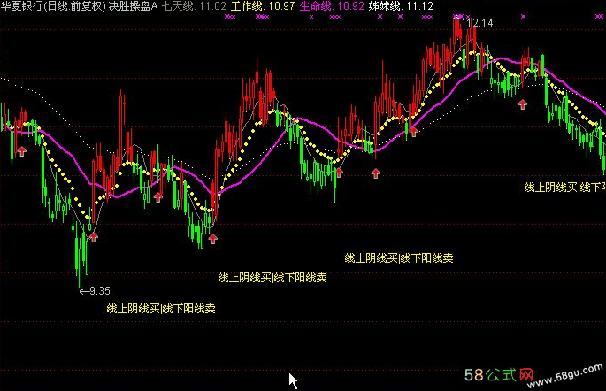 {JSXGWGZX} 七天线:MA(C,7),COLORGRAY; 工作线:(EMA(C,14)),POINTDOT,LINETHICK4,COLORYELLOW; 生命线:(MA(C,25)),LINETHICK2,COLORMAGENTA; {不惑线:(MA(C,40)),COLORCYAN; } 姊妹线:(EMA(C,56)),POINTDOT,COLORWHITE; A3:=EMA((((SLOPE(C,21)) * 20) + C),68); A4:=EMA(C,10); A5:=REF(C,2); A6:=((SMA((MAX((C - A5),0)),6,1)) / (SMA(ABS((C - A5)),6,1))) * 100; A7:=IF(((A6 < (REF(A6,1))) AND (A6 > 79)),A6,0); A8:=LLV(L,21); A9:=HHV(H,21); A10:=EMA((((CLOSE - A8) / (A9 - A8)) * 100),5); A11:=EMA((((CLOSE - A8) / (A9 - A8)) * 50),13); A12:=EMA(((0.667 * (REF(A10,1))) + (0.333 * A10)),2); A13:=LLV(L,55); A14:=HHV(H,34); A15:=EMA((((C - A13) / (A14 - A13)) * 100),3); A16:=(A11 + A15) / 2; A17:=EMA(((0.667 * (REF(A15,1))) + (0.333 * A10)),2); A18:=EMA(A16,5); A19:=EMA(((0.667 * (REF(A18,1))) + (0.333 * A18)),2); A20:=CROSS(A10,A11); A21:=(CROSS(A10,A19)) AND (A19 < 30); A22:=A21 * 0.6; A23:=((C + L) + H) / 3; A24:=EMA(A23,6); A25:=EMA(A24,5); A26:=CROSS(A24,A25); DRAWICON(A26,(LOW / 1.015),1),LINETHICK2,COLORMAGENTA; DRAWTEXT(CROSS(A4,A3),L*0.9,'线上阴线买|线下阳线卖'),LINETHICK4,COLORYELLOW; STICKLINE(((C >= 工作线) AND (C >= O)),H,L,0,1),COLORRED; STICKLINE(((C >= 工作线) AND (C >= O)),O,C,2,1),COLORRED; STICKLINE(((C >= 工作线) AND (C <= O)),H,L,0,0),COLORRED; STICKLINE(((C >= 工作线) AND (C <= O)),O,C,2,0),COLORRED; STICKLINE(((C < 工作线) AND (C >= O)),H,L,0,1),COLORGREEN; STICKLINE(((C < 工作线) AND (C >= O)),O,C,2,1),COLORGREEN; STICKLINE(((C < 工作线) AND (C <= O)),H,L,0,0),COLORGREEN; STICKLINE(((C < 工作线) AND (C <= O)),O,C,2,0),COLORGREEN; |