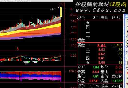 DRAWBAND(MA(CLOSE,5),RGB(155,150,150),MA(CLOSE,24),RGB(83,123,68));DRAWBAND(MA(CLOSE,24),RGB(155,50,50),MA(CLOSE,55),RGB(83,123,68));DRAWBAND(MA(CLOSE,55),RGB(250,250,50),MA(CLOSE,89),RGB(83,123,68));DRAWBAND(MA(CLOSE,89),RGB(240,100,50),MA(CLOSE,188),RGB(83,123,68));DRAWBAND(MA(CLOSE,188),RGB(158,97,177),MA(CLOSE,240),RGB(83,123,68));DRAWKLINE(H,O,L,C);涨停:=IF(REF(C,1)*1.095-C<0.01 ,1,0);STICKLINE(涨停,OPEN,CLOSE,4,0),COLORRED;STICKLINE(涨停,OPEN,CLOSE,3,0),COLORYELLOW;