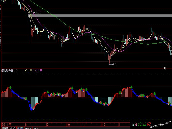 1,DOTLINE; -1,DOTLINE; DIFF:=EMA(CLOSE,21)-EMA(CLOSE,34); DEA:=EMA(DIFF,8); MACD:=20*(DIFF-DEA); MARD:=SMA(MACD,2,1); MARD,COLORSTICK; STICKLINE(MACD>MARD,MACD,MARD,3,0),COLOR0000FF; STICKLINE(MACD<MARD,MACD,MARD,5,0),COLORFF0000; DRAWICON(CROSS(MACD,MARD),MACD,1); DRAWICON(CROSS(MARD,MACD),MARD,2); |