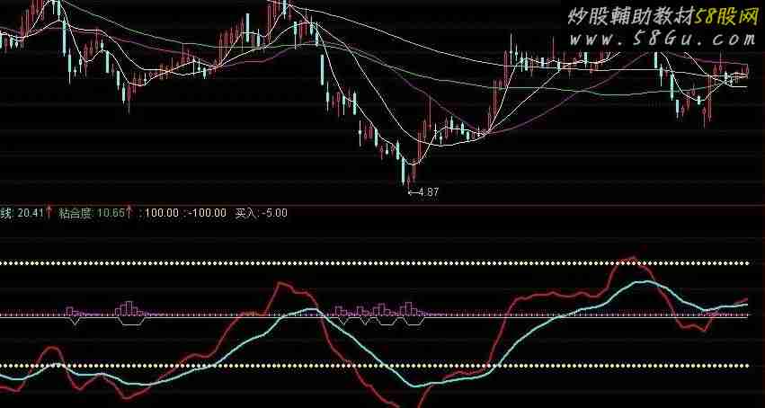 平衡线:0,COLORWHITE,CIRCLEDOT; SC:=100*(CLOSE-MA(CLOSE,80)); 多方线:EMA(SC,5),LINETHICK2,COLORRED; 增强线:EMA(SC,21),LINETHICK2,COLORFFFF00; 粘合度:多方线-增强线,NODRAW; 100,POINTDOT,COLORYELLOW,LINETHICK4; -100,POINTDOT,COLORYELLOW,LINETHICK4; {主力入货} VAR2:=REF(LOW,1); VAR3:=SMA(ABS(LOW-VAR2),3,1)/SMA(MAX(LOW-VAR2,0),3,1)*100; VAR4:=EMA(IF(CLOSE*1.2,VAR3*10,VAR3/10),3); VAR5:=LLV(LOW,38); VAR6:=HHV(VAR4,38); VAR7:=IF(LLV(LOW,90),1,0); VAR8:=EMA(IF(LOW<=VAR5,(VAR4+VAR6*2)/2,0),3)/618*VAR7; ST01:STICKLINE(1,VAR8 ,0,4 ,1 ),COLORF000FF; 主力进场:=VAR8; DD:=VAR8>5; 买入:IF((COUNT(DD,2)=2),-20,-5); |