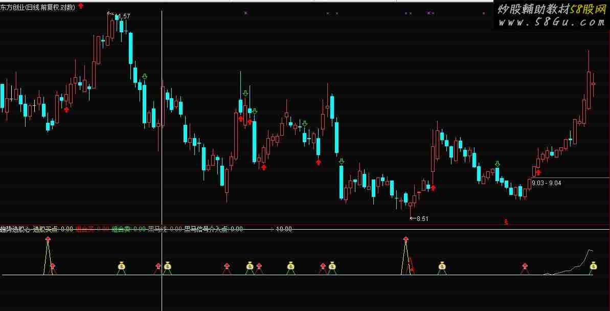 VAR3:=LLV(HIGH,240);VAR4:=100*(CLOSE-VAR3)/VAR3;VAR5:=(CLOSE-LLV(LOW,528))/(HHV(HIGH,528)-LLV(LOW,528))*100;VAR6:=(CLOSE-LLV(CLOSE,530))/(HHV(CLOSE,530)-LLV(CLOSE,530))*100;VAR8:=SMA(MAX(CLOSE-REF(CLOSE,1),0),34,1)/SMA(ABS(CLOSE-REF(CLOSE,1)),7,1)*100;VAR9:=SMA(MAX(CLOSE-REF(CLOSE,1),0),13,1)/SMA(ABS(CLOSE-REF(CLOSE,1)),13,1)*100;VARA:=BARSCOUNT(CLOSE);VARB:=VAR8<20 AND VAR9<23 AND VARA>35;VARC:=VARB AND COUNT(VARB,1)=1;VARD:=EMA(CLOSE,21)-EMA(CLOSE,8);VARE:=EMA(VARD,5);VARF:=TROUGHBARS(3,6,1)<4 AND CROSS(VARD,VARE);VAR10:=IF(TROUGHBARS(3,16,1)=0 AND HIGH>LOW+0.04,4,0);VAR11:=ZIG(3,6)>REF(ZIG(3,6),1) AND REF(ZIG(3,6),1)<=REF(ZIG(3,6),2) AND REF(ZIG(3,6),2)<=REF(ZIG(3,6),3);VAR12:=ZIG(3,6)<REF(ZIG(3,6),1) AND REF(ZIG(3,6),1)>=REF(ZIG(3,6),2) AND REF(ZIG(3,6),2)>=REF(ZIG(3,6),3);VAR13:=ZIG(3,22)>REF(ZIG(3,22),1) AND REF(ZIG(3,22),1)<=REF(ZIG(3,22),2) AND REF(ZIG(3,22),2)<=REF(ZIG(3,22),3);VAR14:=ZIG(3,22)<REF(ZIG(3,22),1) AND REF(ZIG(3,22),1)>=REF(ZIG(3,22),2) AND REF(ZIG(3,22),2)>=REF(ZIG(3,22),3);VAR15:=ZIG(3,51)>REF(ZIG(3,51),1) AND REF(ZIG(3,51),1)<=REF(ZIG(3,51),2) AND REF(ZIG(3,51),2)<=REF(ZIG(3,51),3);VAR16:=ZIG(3,51)<REF(ZIG(3,51),1) AND REF(ZIG(3,51),1)>=REF(ZIG(3,51),2) AND REF(ZIG(3,51),2)>=REF(ZIG(3,51),3);VAR17:=ZIG(3,72)>REF(ZIG(3,72),1) AND REF(ZIG(3,72),1)<=REF(ZIG(3,72),2) AND REF(ZIG(3,72),2)<=REF(ZIG(3,72),3);VAR18:=ZIG(3,72)<REF(ZIG(3,72),1) AND REF(ZIG(3,72),1)>=REF(ZIG(3,72),2) AND REF(ZIG(3,72),2)>=REF(ZIG(3,72),3);VAR19:=EMA(CLOSE,2)-EMA(CLOSE,150);VAR1A:=EMA(VAR19,100);VAR1B:=2*(VAR19-VAR1A);VAR1C:=POW(VAR1B,3)*0.1+POW(VAR1B,1);VAR1D:=SQRT(SQRT(LOW*HIGH*OPEN*CLOSE));VAR1E:=EMA(VAR1D*0.97,3);VAR1F:=(HIGH+LOW+CLOSE)/3;VAR20:=(VAR1F-MA(VAR1F,14))/(0.015*AVEDEV(VAR1F,14));VAR21:=CROSS(VAR1E,LOW);选股买点: VAR10, COLORYELLOW;组合买: (VAR11+VAR13+VAR15+VAR17), , COLORRED;组合卖: (VAR12+VAR14+VAR16+VAR18), , COLORGREEN;黑马线: IF(MONTH<2008 AND VAR1B>0.1,VAR1C,0)*1, , COLOR6699CC;黑马信号介入点: 选股买点 AND VARF AND VARC AND VAR21 AND VAR4<0 AND VAR5<2 AND VAR6=0, , COLORFFFF99;DRAWTEXT(VAR13,0.6,'●'), ,COLORRED;DRAWICON(组合买,组合买,1);DRAWICON(组合卖,组合卖,9);DRAWTEXT(黑马信号介入点>0,4.5,'●我的黑马介入点'), , COLORRED;DRAWICON(选股买点>0,4.2,1);DRAWTEXT(选股买点 AND VARF AND VARC,2.8,' 30%下单莫错过!'), , COLORMAGENTA;DRAWTEXT(VAR18,3,'空仓'), , COLORGREEN;DRAWTEXT(VAR20<-110 AND 选股买点>0,2,'选股买点'), ,COLORYELLOW;DRAWTEXT(VAR17,1.3,'发现黑马'), , COLORFF6600;DRAWTEXT(选股买点 AND VAR20<-100 AND VARF AND VARC>0,4.1,'★组合5分钟线选股思路获利5%以上'), , COLORRED;-10; |