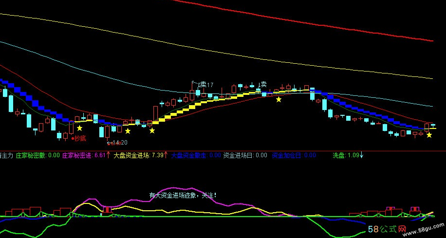 V1:=(C*2+H+L)/4*10; V2:=EMA(V1,13)-EMA(V1,34); V3:=EMA(V2,5); V4:=2*(V2-V3)*5.5; 庄家秘密撤: IF(V4<=0,V4,0),COLOR00FF00,LINETHICK2; 庄家秘密进: IF(V4>=0,V4,0),COLORFF00FF,LINETHICK2; V5:=(HHV(INDEXH,8)-INDEXC)/(HHV(INDEXH,8)-LLV(INDEXL,8))*8; V6:=EMA(3*V5-2*SMA(V5,18,1),5); V7:=(INDEXC-LLV(INDEXL,8))/(HHV(INDEXH,8)-LLV(INDEXL,8))*10; V8:=(INDEXC*2+INDEXH+INDEXL)/4; V9:=EMA(V8,13)-EMA(V8,34); VA:=EMA(V9,3); VB:=(V9-VA)/2; 大盘资金进场: IF(VB>=0,VB,0),COLORYELLOW,LINETHICK2; 大盘资金撤走: IF(VB<=0,VB,0),COLORBLUE,LINETHICK2;AA:=WINNER(CLOSE+CLOSE*15/100)*100; BB:=WINNER(CLOSE+CLOSE*0/100)*100; CC:=AA-BB; DD:=(WINNER(CLOSE-CLOSE*0.1/100)-WINNER(CLOSE-CLOSE*15/100))*100; EE:=CC<3 AND DD<0.5; A1:=DYNAINFO(6); A2:=IF(LOW>A1,0,IF(HIGH<A1,1,(A1-LOW+0.01)/(HIGH-LOW+0.01))); A3:=VOL/WINNER(LOW); A4:=ref(HHV(CLOSE,120),1); A5:=ref(LLV(CLOSE,120),1); A6:=100*(CLOSE-A5)/(A4-A5); A7:=A2>0 OR A2=1; A8:=A7 AND A3/ref(A3,3)>=3 AND A6<80; A9:=ref(A8,1) OR ref(A8,2) OR ref(A8,3) OR ref(A8,4); A10:=A8 AND A9; A11:=IF(FILTER(A8,3),5,0); A12:=IF(FILTER(A10,3) OR EE,10,0); 资金进场日:IF(A11,8,0),LINETHICK0; STICKLINE(A12,0,15,5,1),COLORFF00FF; 资金加仓日:IF(A12,88,0),LINETHICK0; STICKLINE(A12,0,15,5,1),COLORFF00FF;STICKLINE(A11,0,5,1,0),COLORFFEE00;STICKLINE(A12,0,15,1,0),COLOR1020FF; DRAWTEXT(A11,8,'资金进场');DRAWTEXT(A12,17,'资金加仓'); VAR1:=ref(LOW,1); VAR2:=SMA(ABS(LOW-VAR1),13,1)/SMA(MAX(LOW-VAR1,0),13,1)*4; VAR3:=EMA(VAR2,13); VAR4:=LLV(LOW,34); VAR5:=EMA(IF(LOW<=VAR4,VAR3,0),3); 主力进场: STICKLINE(VAR5>ref(VAR5,1),0,VAR5,7,1 ),COLORRED; 洗盘:IF(VAR5<ref(VAR5,1),VAR5,0),COLORGREEN,LINETHICK2; STICKLINE(VAR5<ref(VAR5,1),0,VAR5,2,1),COLORGREEN;VAR6:=100-3*SMA((CLOSE-LLV(LOW,75))/(HHV(HIGH,75)-LLV(LOW,75))*100,20,1)+2*SMA(SMA((CLOSE-LLV(LOW,75))/(HHV(HIGH,75)-LLV(LOW,75))*100,20,1),15,1); VAR7:=100-3*SMA((OPEN-LLV(LOW,75))/(HHV(HIGH,75)-LLV(LOW,75))*100,20,1)+2*SMA(SMA((OPEN-LLV(LOW,75))/(HHV(HIGH,75)-LLV(LOW,75))*100,20,1),15,1); VAR8:=VAR6<ref(VAR7,1) AND VOL>ref(VOL,1) AND CLOSE>ref(CLOSE,1); DRAWTEXT(VAR8 AND COUNT(VAR8,30)=1,40,'有大资金进场迹象,关注!');