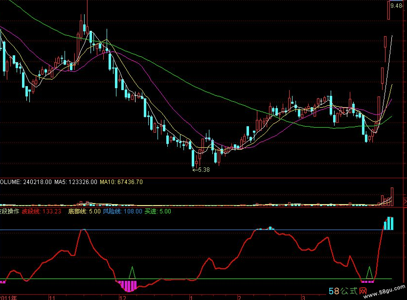 波段线: 5*SMA((CLOSE-LLV(LOW,27))/(HHV(HIGH,27)-LLV(LOW,27))*100,5,1)-3*SMA(SMA((CLOSE-LLV(LOW,27))/(HHV(HIGH,27)-LLV(LOW,27))*100,5,1),3,1)-SMA(SMA(SMA((CLOSE-LLV(LOW,27))/(HHV(HIGH,27)-LLV(LOW,27))*100,5,1),3,1),2,1),LINETHICK2,COLORRED;M1:=EMA(MA(波段线,5),3);STICKLINE(波段线>108 AND 波段线>=M1,波段线,108,2,0),COLORF0F000;STICKLINE(波段线<0 AND 波段线<M1,波段线,0,2,0),COLORF00FF0;底部线: 5,COLOR00FFFF;风险线: 108,COLORFF9D00;底部买:=LLV(波段线,2)=LLV(波段线,8);买进:IF(CROSS(波段线,REF(波段线+0.01,1)) AND 底部买 AND 波段线<0,30,5); |