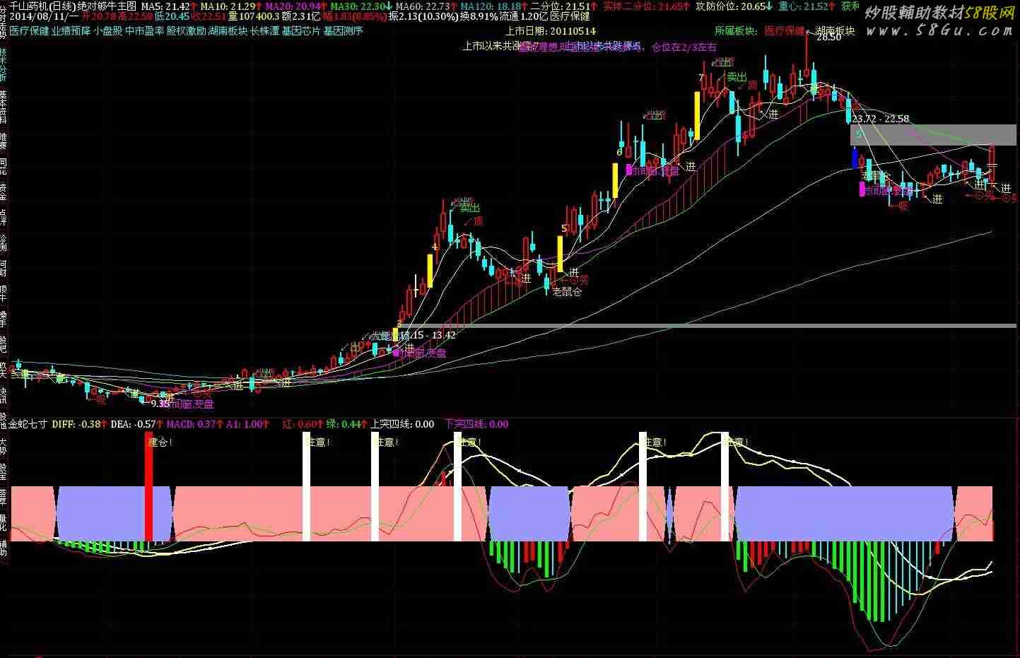 {金蛇七寸}VAR10:=100*(C-COST(10))/COST(10);空跌:=REF(VAR10,1)<0 OR REF (VAR10,2)<0;DIFF:EMA(CLOSE,12) - EMA(CLOSE,26),COLORYELLOW,LINETHICK2;DEA:EMA(DIFF,9)COLORWHITE,LINETHICK2;MACD: 2*(DIFF-DEA), COLORSTICK,LINETHICK2;A1:EMA(C,13)>REF(EMA(C,13),1) AND MACD>REF(MACD,1),COLORFF00FF,LINETHICK0;A2:=EMA(C,13)<REF(EMA(C,13),1) AND MACD<REF(MACD,1);STICKLINE(A1>0 ,0,MACD,1.5,0),COLORRED;STICKLINE(A2>0 ,0,MACD,1.5,0),COLORGREEN;DRAWBAND(DIFF>DEA,RGB(255,153,153),DIFF<DEA,RGB(153,153,255)); DIFF2:=EMA(CLOSE,9)-EMA(CLOSE,26);DEA2:=EMA(DIFF2,9);红:((2)*(DIFF2-DEA2)),COLOR0000FF;绿:MA(((2)*(DIFF2-DEA2)),5),COLORGREEN;DA:=MAX(DIFF,DEA);上突四线:CROSS(红,DA) AND 绿>DIFF AND 绿<0 AND 空跌>0,COLORLIBLUE,LINETHICK0;STICKLINE(上突四线>0,0,2,4,0),COLORRED;DRAWTEXT(上突四线>0,1.8,'建仓!'),COLORYELLOW;下突四线:CROSS(绿,红) AND 绿<DIFF AND 绿>0 ,COLORFF00FF,LINETHICK0;STICKLINE(下突四线>0,0,2,4,0),COLORWHITE;DRAWTEXT(下突四线>0,1.8,'注意!'),COLORYELLOW; |