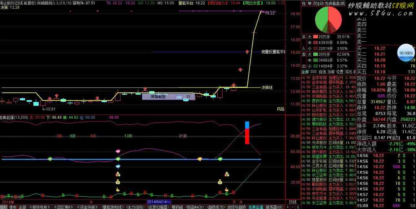 获利%:WINNER(CLOSE)*100,NODRAW,COLORWHITE;DRAWTEXT_FIX(获利%>=95 AND ISLASTBAR,0.97,0.97,0,'高危'),COLORRED;DRAWTEXT_FIX(获利%>=80 AND 获利%<95 AND ISLASTBAR,0.97,0.97,0,'风险'),COLORYELLOW;DRAWTEXT_FIX(获利%>=50 AND 获利%<80 AND ISLASTBAR,0.97,0.97,0,'安全'),COLORGREEN;DRAWTEXT_FIX(获利%<50 AND ISLASTBAR,0.97,0.97,0,'空头'),COLORBLUE;STICKLINE((C-REF(C,1))*100/REF(C,1)>=(10-0.01*100/REF(C,1)),OPEN,CLOSE,3,0),COLOR0055FF;STICKLINE((REF(C,1)-C)*100/REF(C,1)>=(10-0.01*100/REF(C,1)),OPEN,CLOSE,3,0),COLOR00FF00;T1:=CONST(HHVBARS(V,N));T0:IF(CURRBARSCOUNT<=N+3,CONST(IF(T1=0,C,REF(C,T1))),DRAWNULL),COLORFF00FF;IF(CURRBARSCOUNT=T1+1,T0,DRAWNULL),CIRCLEDOT,COLORFF00FF;DRAWTEXT(ISLASTBAR,T0,' 量能平台'),COLORCC00CC;Q1:=CONST(REF(HHVBARS(V,M),T1+1)+T1+1);Q0:IF(CURRBARSCOUNT<=T1+M+3 AND CURRBARSCOUNT>=T1+1,CONST(REF(C,Q1)),DRAWNULL),COLOR009900;IF(CURRBARSCOUNT=Q1+1,Q0,DRAWNULL),CIRCLEDOT,COLOR00CC00;M1:=CONST(LLVBARS(V,M));M0:IF(CURRBARSCOUNT<=M+7,CONST(IF(M1=0,O,REF(O,M1))),DRAWNULL); IF(CURRBARSCOUNT=M1+1,M0,DRAWNULL),CIRCLEDOT;DRAWTEXT(ISLASTBAR,M0,' 地量反量能平台'); HV:=HHV(V,8)=V OR V/REF(V,1)>=2;n,m=10FT:=BARSLAST(HV);量能平台:IF(HV,C,REF(C,FT)),COLORYELLOW,LINETHICK2;DP:=IF(C=INDEXC,0,1);GJ:=AMOUNT/V/100;【明日阻力】:L+(GJ-L)+(C-L),COLORRED,NODRAW;【明日支撑】:L+(C-GJ),NODRAW;年:=YEAR,NODRAW;月:=MONTH,NODRAW;星期:=WEEKDAY,NODRAW;日1:=DATETODAY(DATE);上市日:=REF(DATE,TOTALBARSCOUNT-CURRBARSCOUNT);自然日:=日1-DATETODAY(上市日)+1;ZB:=(自然日-REF(自然日,1))!=星期-REF(星期,1)OR TOTALBARSCOUNT-CURRBARSCOUNT=0;本周第几天:=BARSLAST(ZB)+1;本月第几天:=BARSLAST(年*100+月!=REF(年*100+月,1))+1;MA1:=REF(C,本周第几天);MA2:=REF(MA1,本周第几天);MA3:=REF(MA2,本周第几天);MA4:=REF(MA3,本周第几天);MA5:=REF(MA4,本周第几天);MA6:=REF(MA5,本周第几天);MA7:=REF(MA6,本周第几天);MA8:=REF(MA7,本周第几天);MA9:=REF(MA8,本周第几天);十周价:=(C+MA1+MA2+MA3+MA4+MA5+MA6+MA7+MA8+MA9)/10;决策:REFDATE(十周价,DATE),COLORYELLOW,LINETHICK1;DRAWTEXT(ISLASTBAR,决策,' 决策线'),COLORYELLOW;DRAWICON(C>量能平台,H,1);