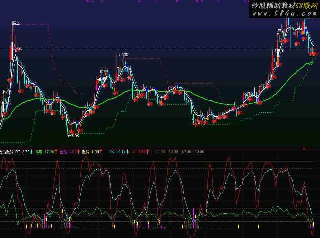 R3:=SMA(ABS(L-REF(L,1)),3,1)/SMA(MAX(L-REF(L,1),0),3,1)*100; R4:=EMA(R3*10,3); R7:EMA(IF(L<=LLV(L,13),HHV(R4,13),0),3)/700,NODRAW; RSV:=(C-LLV(L,9))/(HHV(H,9)-LLV(L,9))*100; K:=SMA(RSV,3,1); D:=SMA(K,3,1); J:=3*K-2*D,; 乖离:(C-MA(C,6))/MA(C,6)*200+20,COLORGREEN; 追击:R7>1 AND J>REF(J,1) AND REF(J,1)<REF(J,2),COLORMAGENTA,NODRAW; 反转:REF(C<=LLV(C,8),1)AND C>REF(C,1),COLORYELLOW,NODRAW; {BETWEEN(R7,0.01,1) AND} {J>REF(J,1) AND REF(J,1)<REF(J,2)} STICKLINE(R7>0,0,R7,1,-1),COLORGRAY; STICKLINE(追击=1,0,R7,1,0),COLORMAGENTA; STICKLINE(反转=1,R7,R7+5,1,0),COLORYELLOW; KK:K,COLORCYAN; JJ:J,COLORRED; 100,COLORBROWN; 90,COLOR008899,DOTLINE; 10,COLORGRAY,DOTLINE; 30,COLORGRAY,DOTLINE; |