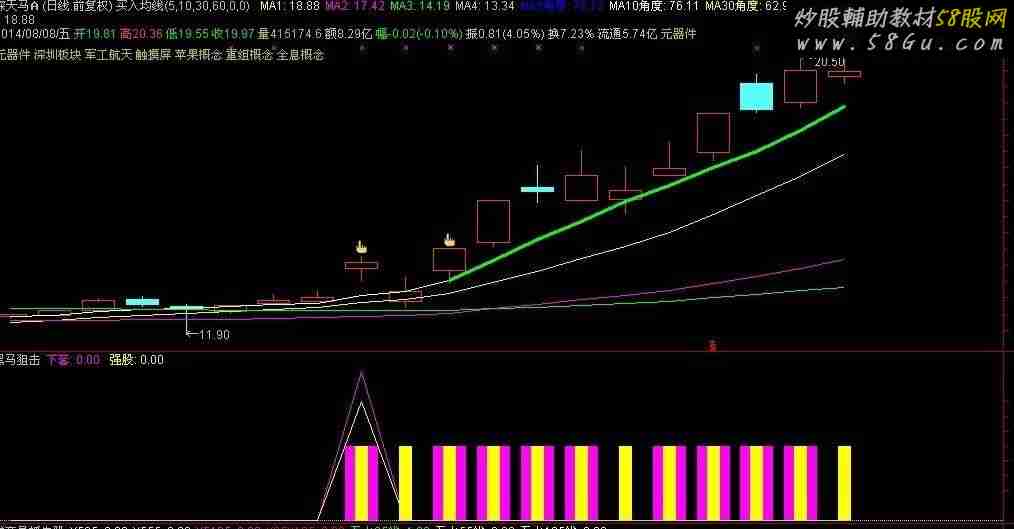 VAR1:=EMA(EMA(CLOSE,9),9);VAR2:=(VAR1-REF(VAR1,1))/REF(VAR1,1)*100;VAR3:=100*WINNER(CLOSE*0.95);下套:FILTER(CROSS(VAR3,30),18),COLORFF00FF;STICKLINE(VAR3>30 AND COST(30)<CLOSE AND VAR2>0 AND VAR2>REF(VAR2,1),0.5,0,3,0),COLORFF00FF;M:=27;MAA:=MA(C,19);角度MAA:=ATAN((MAA/REF(MAA,1)-1)*100)*180/3.1416;QS:=角度MAA>M;强股:IF(REF(COUNT(QS=0,20)=20,1) AND QS=1,0.8,0);STICKLINE(QS=1 AND C>MA(C,7),0.5,0,1,0),COLOR00FFFF;