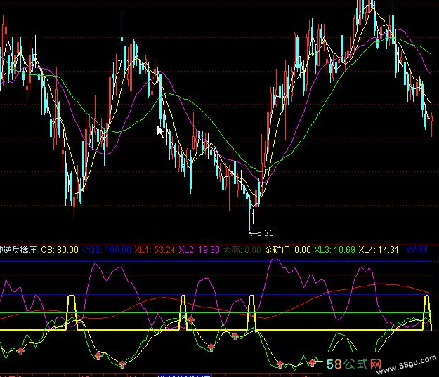 股神逆反擒庄QS:80,COLOR00FFFF; CQS:100,COLORBLUE; VAR1:=(CLOSE-LLV(LOW,60))/(HHV(HIGH,60)-LLV(LOW,60))*80; VAR2:=SMA(VAR1,10,1); XL1:SMA(VAR2,5,1),COLORRED; RSV:= ((HHV(HIGH,9)-CLOSE)/(HHV(HIGH,9)-LLV(LOW,9))*100)-70; RSV1:= (CLOSE-LLV(LOW,9))/(HHV(HIGH,9)-LLV(LOW,9))*100; FATK:=SMA(RSV1,3,1); VARA:=(CLOSE-LLV(LOW,9))/(HHV(HIGH,9)-LLV(LOW,9))*100; VARB:=SMA(VARA,3,1); VARC:=SMA(VARB,3,1); XL2: EMA(3*VARB-2*VARC,3),COLORFF00FF; 大底:0,COLOR007300; VAR11:=LLV(LOW,5)=LLV(LOW,45) AND CLOSE>=OPEN*1.04; VAR22:=CLOSE>(REF(HIGH,1)+REF(LOW,1))/2; 买入:=VAR11 AND VAR22,STICK,LINETHICK2,COLORRED; VAR3:=REF(CLOSE,1); VAR4:=SMA(MAX(CLOSE-VAR3,0),6,1)/SMA(ABS(CLOSE-VAR3),6,1)*100; 卖出:=CROSS(80,VAR4),STICK,LINETHICK2,COLORGREEN; {波段介入点} A1:=REF(CLOSE,2); A2:=SMA(MAX(CLOSE-A1,0),7,1)/SMA(ABS(CLOSE-A1),7,1)*100; 金矿门:IF(A2<19,50,0)COLOR00FFFF,LINETHICK2.8; ARSV:=(CLOSE-LLV(LOW,9))/(HHV(HIGH,9)-LLV(LOW,9))*100; XL3:SMA(RSV,3,1)COLORGREEN; XL4:SMA(XL3,3,1); XH:=XL3>REF(XL3,1) AND REF(XL3,1)<REF(XL3,2) AND XL3<XL4; DRAWICON(XH,XL3*0.95,1); WYFF:51.88,COLORBLUE; AWJFF:25.98,COLORGREEN,LINETHICK1.8; |