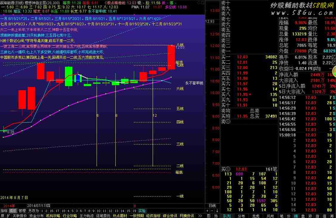 DRAWGBK(O>C,RGB(57,35,146),RGB(0,0,0),0,'1',0); AB:=EMA(((2*C+H+L)/4-LLV(LOW,30))/(HHV(HIGH,30)-LLV(LOW,30))*100,8); BA:=EMA(AB,5); A1{高}:=REFDATE(REF(HHV(H,96),5),DATE); B1{低}:=REFDATE(REF(LLV(L,96),5),DATE); 箱顶:IF(AB>0 AND AB-BA<=0,A1,A1),COLORGREEN,DOTLINE; 箱底:IF(AB>0 AND AB-BA<=0,B1,B1),COLORRED,DOTLINE; 费氏数:=H=HHV(H,FSS); 成立距今:=BARSLAST(费氏数); H天数:STICKLINE(成立距今=6 OR 成立距今=8 OR 成立距今=12 OR 成立距今=14 OR 成立距今=15 OR 成立距今=18 OR 成立距今=19 OR 成立距今=20 OR 成立距今=21 OR 成立距今=23 OR 成立距今=28 OR 成立距今=31 ,箱顶,箱底,0,0),COLORYELLOW; DRAWTEXT(ISLASTBAR,箱顶,' 箱顶'),COLORYELLOW; DRAWTEXT(ISLASTBAR,箱底,' 箱底'),COLORYELLOW; C极点精准线:CONST(REF(C,0)),COLOR7777FF; K:=BARSLAST(CURRBARSCOUNT=NMT); GD:=CONST(IF(ISLASTBAR=1,HHV(H,K),0)),NODRAW; DDA:=CONST(IF(ISLASTBAR=1,LLV(L,K),0)),NODRAW; KJ:=GD-DDA; DIF:=EMA(CLOSE,9)-EMA(CLOSE,21); 吸:XLPL.NOTEXT吸,NODRAW; 拉:XLPL.NOTEXT拉,NODRAW; 派:XLPL.NOTEXT派,NODRAW; 落:XLPL.NOTEXT落,NODRAW; AAW:=IF(吸!=DRAWNULL,DIF,DRAWNULL),COLORLIRED,LINETHICK2; BBW:=IF(拉!=DRAWNULL,DIF,DRAWNULL),COLORRED,LINETHICK2; CCW:=IF(派!=DRAWNULL,DIF,DRAWNULL),COLORGREEN,LINETHICK2; DDW:=IF(落!=DRAWNULL,DIF,DRAWNULL),COLORWHITE,LINETHICK2; STICKLINE(AAW,LOW,HIGH,0,0),COLORLIRED; STICKLINE(AAW,C,O,3,0),COLORLIRED; STICKLINE(BBW,LOW,HIGH,0,0),COLORRED; STICKLINE(BBW ,C,O,3,0),COLORRED; STICKLINE(CCW,LOW,HIGH,0,0),COLORGREEN; STICKLINE(CCW,C,O,3,0)COLORGREEN; STICKLINE(DDW,LOW,HIGH,0,0),COLORWHITE; STICKLINE(DDW,C,O,3,0),COLORWHITE; VAR1:=CLOSE>REF(CLOSE,1) AND CLOSE>REF(CLOSE,2); VAR2:=REF(VAR1,1) AND CLOSE<=REF(CLOSE,1) AND CLOSE>=REF(CLOSE,2); VAR3:=REF(VAR2,1) AND CLOSE>=REF(CLOSE,1) AND CLOSE<=REF(CLOSE,2); VAR4:=REF(VAR3,1) AND CLOSE<=REF(CLOSE,1) AND CLOSE>=REF(CLOSE,2); VAR5:=REF(VAR4,1) AND CLOSE>=REF(CLOSE,1) AND CLOSE<=REF(CLOSE,2); VAR6:=REF(VAR5,1) AND CLOSE<=REF(CLOSE,1) AND CLOSE>=REF(CLOSE,2); VAR7:=REF(VAR6,1) AND CLOSE>=REF(CLOSE,1) AND CLOSE<=REF(CLOSE,2); VAR8:=REF(VAR7,1) AND CLOSE<=REF(CLOSE,1) AND CLOSE>=REF(CLOSE,2); VAR9:=REF(VAR8,1) AND CLOSE>=REF(CLOSE,1) AND CLOSE<=REF(CLOSE,2); VARA:=REF(VAR9,1) AND CLOSE<=REF(CLOSE,1) AND CLOSE>=REF(CLOSE,2); VARB:=REF(VARA,1) AND CLOSE>=REF(CLOSE,1) AND CLOSE<=REF(CLOSE,2); VARC:=REF(VARB,1) AND CLOSE<=REF(CLOSE,1) AND CLOSE>=REF(CLOSE,2); VARD:=CLOSE<REF(CLOSE,1) AND CLOSE<REF(CLOSE,2); VARE:=REF(VARD,1) AND CLOSE>=REF(CLOSE,1) AND CLOSE<=REF(CLOSE,2); VARF:=REF(VARE,1) AND CLOSE<=REF(CLOSE,1) AND CLOSE>=REF(CLOSE,2); VAR10:=REF(VARF,1) AND CLOSE>=REF(CLOSE,1) AND CLOSE<=REF(CLOSE,2); VAR11:=REF(VAR10,1) AND CLOSE<=REF(CLOSE,1) AND CLOSE>=REF(CLOSE,2); VAR12:=REF(VAR11,1) AND CLOSE>=REF(CLOSE,1) AND CLOSE<=REF(CLOSE,2); VAR13:=REF(VAR12,1) AND CLOSE<=REF(CLOSE,1) AND CLOSE>=REF(CLOSE,2); VAR14:=REF(VAR13,1) AND CLOSE>=REF(CLOSE,1) AND CLOSE<=REF(CLOSE,2); VAR15:=REF(VAR14,1) AND CLOSE<=REF(CLOSE,1) AND CLOSE>=REF(CLOSE,2); VAR16:=REF(VAR15,1) AND CLOSE>=REF(CLOSE,1) AND CLOSE<=REF(CLOSE,2); VAR17:=REF(VAR16,1) AND CLOSE<=REF(CLOSE,1) AND CLOSE>=REF(CLOSE,2); VAR18:=REF(VAR17,1) AND CLOSE>=REF(CLOSE,1) AND CLOSE<=REF(CLOSE,2); VAR19:=REF(VARD OR VARE OR VARF OR VAR10 OR VAR11 OR VAR12 OR VAR13 OR VAR14 OR VAR15 OR VAR16 OR VAR17 OR VAR18,1) AND VAR1; VAR1A:=REF(VAR1 OR VAR2 OR VAR3 OR VAR4 OR VAR5 OR VAR6 OR VAR7 OR VAR8 OR VAR9 OR VARA OR VARB OR VARC,1) AND VARD; STICKLINE(VAR19,C,O,1.5,0),COLORBROWN; {WWW.88GS.COM} STICKLINE(VAR1A,C,O,1.5,0),COLORBLUE; DRAWTEXT(成立距今=6,箱顶*0.8,'6'),COLORYELLOW; DRAWTEXT(成立距今=8,箱顶*0.8,'8'),COLORYELLOW; DRAWTEXT(成立距今=12,箱顶*0.8,'12'),COLORYELLOW; DRAWTEXT(成立距今=14,箱顶*0.8,'14'),COLORYELLOW; DRAWTEXT(成立距今=15,箱顶*0.8,'15'),COLORYELLOW; DRAWTEXT(成立距今=18,箱顶*0.8,'18'),COLORYELLOW; DRAWTEXT(成立距今=19,箱顶*0.8,'19'),COLORYELLOW; DRAWTEXT(成立距今=20,箱顶*0.8,'20'),COLORYELLOW; DRAWTEXT(成立距今=21,箱顶*0.8,'21'),COLORYELLOW; DRAWTEXT(成立距今=23,箱顶*0.8,'23'),COLORYELLOW; DRAWTEXT(成立距今=28,箱顶*0.8,'28'),COLORYELLOW; DRAWTEXT(成立距今=31,箱顶*0.8,'31'),COLORYELLOW; 一:IF(CURRBARSCOUNT<=5,DDA+KJ*0.1,DRAWNULL),COLORYELLOW,DOTLINE; 二: IF(CURRBARSCOUNT<=5,DDA+KJ*0.28,DRAWNULL),COLORYELLOW,DOTLINE; 三:IF(CURRBARSCOUNT<=5,DDA+KJ*0.41,DRAWNULL),COLORYELLOW,DOTLINE; 四:IF(CURRBARSCOUNT<=5,DDA+KJ*0.54,DRAWNULL),COLORYELLOW,DOTLINE; 五:IF(CURRBARSCOUNT<=5,DDA+KJ*0.62,DRAWNULL),COLORYELLOW,DOTLINE; 六:IF(CURRBARSCOUNT<=5,DDA+KJ*0.74,DRAWNULL),COLORYELLOW,DOTLINE; 七:IF(CURRBARSCOUNT<=5,DDA+KJ*0.88,DRAWNULL),COLORYELLOW,DOTLINE; 八:IF(CURRBARSCOUNT<=5,DDA+KJ*1,DRAWNULL),COLORYELLOW,DOTLINE; DRAWTEXT(CURRBARSCOUNT=1,一,' 一线'),COLOR00FFFF; DRAWTEXT(CURRBARSCOUNT=1,二,' 二线'),COLOR00FFFF; DRAWTEXT(CURRBARSCOUNT=1,三,' 三线'),COLOR00FFFF; DRAWTEXT(CURRBARSCOUNT=1,四,' 四线'),COLOR00FFFF; DRAWTEXT(CURRBARSCOUNT=1,五,' 五线'),COLOR00FFFF; DRAWTEXT(CURRBARSCOUNT=1,六,' 六线'),COLOR00FFFF; DRAWTEXT(CURRBARSCOUNT=1,七,' 七线'),COLOR00FFFF; DRAWTEXT(CURRBARSCOUNT=1,八,' 八线'),COLOR00FFFF; PMA:MA(C,5),COLORWHITE,LINETHICK2; IF(PMA>REF(PMA,1),PMA,DRAWNULL),COLORRED,LINETHICK2; IF(PMA<REF(PMA,1),PMA,DRAWNULL),COLORGREEN,LINETHICK2; X:=(3*C+L+O+H)/6; 多空线:(20*X+19*REF(X,1)+18*REF(X,2)+17*REF(X,3)+16*REF(X,4)+15*REF(X,5)+14*REF(X,6) +13*REF(X,7)+12*REF(X,8)+11*REF(X,9)+10*REF(X,10)+9*REF(X,11)+8*REF(X,12) +7*REF(X,13)+6*REF(X,14)+5*REF(X,15)+4*REF(X,16)+3*REF(X,17)+2*REF(X,18)+ REF(X,20))/210,COLORFF00FF,LINETHICK2; {用法:黄托底买进,蓝压顶卖出。} DD:=多空线<REF(多空线,1); IF(DD,多空线,DRAWNULL),COLOR00FFFF,LINETHICK2; A:=(PMA>多空线); IF(A,多空线,DRAWNULL),COLOR33FF33,POINTDOT,LINETHICK4; P:=5;P1:=13; {N为多少天内的高低值参数,我以自已的初始K线根数定义。 P1、P2为短、长支撑压力取点参数} A1S:=REF(H,P)=HHV(H,2*P+1); B1S:=FILTER(A1S,P); C1S:=BACKSET(B1S,P+1); D1S:=FI