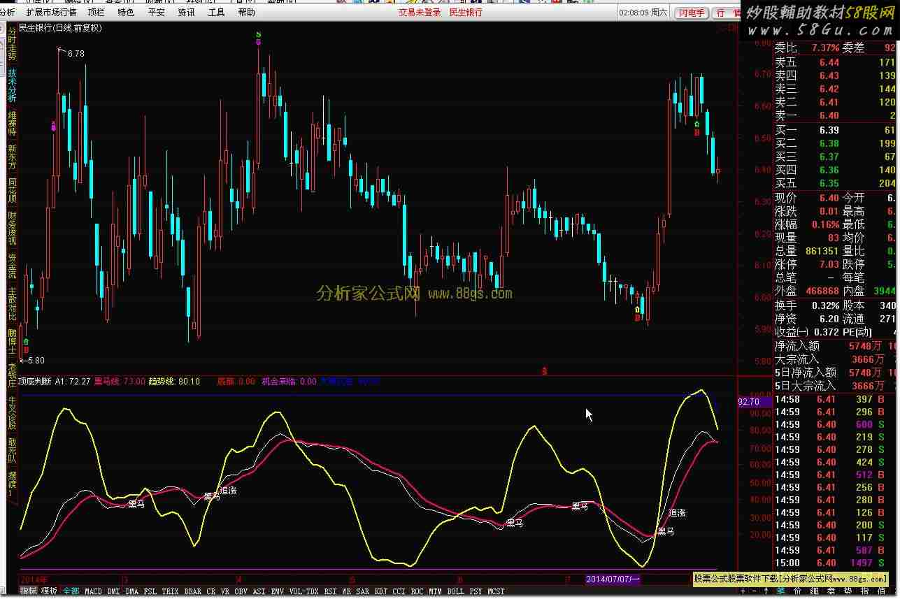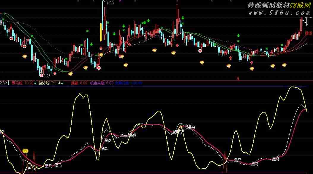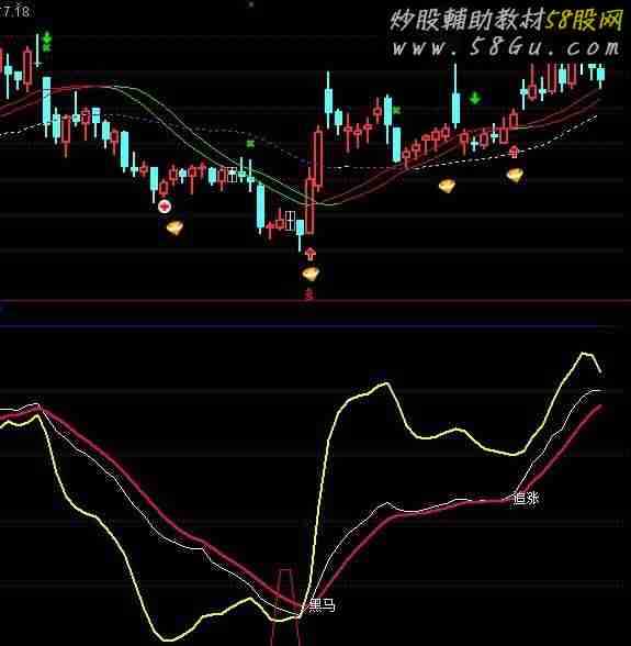 一直用着都很不错的顶底判断指标,成功率高A1:3*SMA((C-LLV(L,55))/(HHV(H,55)-LLV(L,55))*100,5,1)-2*SMA((C-LLV(L,55))/(HHV(H,55)-LLV(L,55))*100,5,1); 黑马线:EMA(A1,5),LINETHICK2,COLOR6600FF; A2:=(黑马线-REF(黑马线,1))/REF(黑马线,1)*100; A3:=EMA(C,5); A4:=((C-LLV(L,21))/(HHV(H,21)-LLV(L,21)))*100; 趋势线:(MA(3*SMA(A4,6,1)-2*SMA(SMA(A4,5,1),5,1),2)),LINETHICK2,COLORYELLOW; A5:=(HHV(H,60)-C)/(HHV(H,60)-LLV(L,60))*100; DRAWTEXT(FILTER(REF(黑马线,1)>90 AND A2<0,7),黑马线,'跑'),COLOR00FF00; DRAWTEXT(CROSS(A1,黑马线)AND 黑马线<A5,黑马线,'黑马'); DRAWTEXT(CROSS(黑马线,A5)AND 趋势线<80,黑马线,'追涨'); DRAWTEXT(CROSS(趋势线,0)AND 黑马线<40,5,'大黑马'); 底部:(A2<-10 AND A2>REF(A2,1))*25,COLORRED; DRAWICON(底部 AND A3>REF(A3,1),25,4); 机会来临:REF(IF((MA(C,5)-C)/C>0.04 AND (MA(C,10)-MA(C,5))/MA(C,5)>0.04,30,0),1),COLORF00FF0; 大势已去:IF(CROSS(黑马线,A1)AND 黑马线>70 AND 趋势线>80,90,100),COLORFF0000;