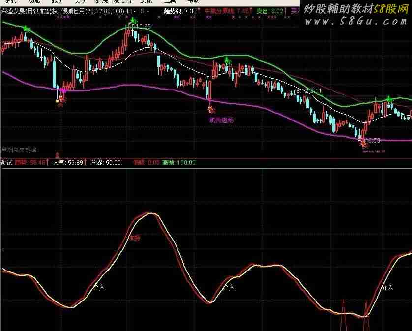 M1:=(CLOSE,10); VAR1:=IF(DATE<1340830 AND DATE>900101,1,0); VAR2:=IF(MONTH<12,1,100000); VAR3:=(2*CLOSE+HIGH+LOW)/4; VAR4:=LLV(LOW,34); VAR5:=HHV(HIGH,34); 趋势: EMA((VAR3-VAR4)/(VAR5-VAR4)*100,13),LINETHICK2,COLORRED; 人气: EMA(0.667*REF(趋势,1)+0.333*趋势,2),LINETHICK2,COLORYELLOW; 分界: 50*VAR1,COLORWHITE;DRAWTEXT(CROSS(趋势,30) AND 人气<趋势,30,'介入'),COLORYELLOW; DRAWTEXT(CROSS(趋势,60) AND 人气<趋势,60,'加持'),COLORRED; DRAWTEXT(CROSS(趋势,80) AND 人气<趋势,80,'减仓'),COLORMAGENTA; DRAWTEXT(CROSS(人气,趋势) AND 人气>80,80,'出手'),COLORGREEN; 低吸: IF(CROSS(趋势,人气) AND 趋势<15,20,0),COLORRED; 高抛: IF(CROSS(人气,趋势) AND 人气>85,80,100),COLORGREEN;