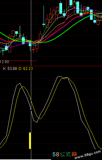 MA5:=MA(CLOSE,5); MA10:=MA(CLOSE,10);五强:=MA5>REF(MA5,1); 十强:=MA10>REF(MA10,1); 小均强:=五强 AND 十强;强势线1:=HHV(MA((((LOW + HIGH) + CLOSE) / 3),8),60); 强势线2:=HHV(MA((((LOW + HIGH) + CLOSE) / 3.18),8),20); 强势线3:=HHV(MA((((LOW + HIGH) + CLOSE) / 3.258),8),10); 强势线4:=HHV(MA((((LOW + HIGH) + CLOSE) / 3.08),80),13);开始走强1:=强势线1>REF(强势线1,1); 开始走强2:=强势线2>REF(强势线2,1); 开始走强3:=强势线3>REF(强势线3,1); 开始走强4:=强势线4>REF(强势线3,1); 双强1:=开始走强1 AND 开始走强2; 双强2:=开始走强2 AND 开始走强3; 双强3:=开始走强2 AND 开始走强3; 双强4:=开始走强3 AND 开始走强4; 三强:=开始走强1 AND 开始走强2 AND 开始走强3; 四强:=开始走强1 AND 开始走强2 AND 开始走强3 AND 开始走强4; 强势为王:=双强1 OR 双强2 OR 双强3 OR 双强4 OR 三强 OR 四强;VV:=(C+L+H)/3; DSA:=SMA(XMA(VV,15),2,1); 底部1:=DSA*0.9518;MA1:=MA(CLOSE,5); MA2:=MA(CLOSE,10); MA3:=MA(CLOSE,20); MA4:=MA(CLOSE,60); 五日走强:=MA1>REF(MA1,1); 十日走强:=MA2>REF(MA2,1); 二十日走强:=MA3>REF(MA3,1); 六十日走强:=MA4>REF(MA4,1); 低位主升:=五日走强 AND 十日走强 AND 六十日走强; 主升浪:=五日走强 AND 十日走强 AND 二十日走强; 大主升浪:=十日走强 AND 二十日走强 AND 六十日走强; 大主升浪2:=五日走强 AND 十日走强 AND 二十日走强 AND 六十日走强; 总主升:=主升浪 AND 大主升浪 AND 大主升浪2; 总主升浪:=低位主升 OR 主升浪 OR 大主升浪 OR 大主升浪2 OR 总主升; 低买:L<底部1 AND 总主升浪 AND 强势为王 AND C<DSA,NODRAW,COLORGREEN,LINETHICK1; STICKLINE(低买,0,15,2,0),COLORGREEN; 猎股:L<底部1 AND C<DSA AND 强势为王,NODRAW,COLORYELLOW,LINETHICK1; STICKLINE(猎股,15,30,2,0),COLORYELLOW; 猎股大王出击:=低买 AND 猎股 AND H<DSA;A:=MA(C,30); A1:=A*1.1; A4:=A*0.9; A2:=A1-(A1-A4)*0.191; 持仓:=IF(HIGH*1.01>A2 OR REF(HIGH,1)>REF(A2,1),A1,A4); 生命线:=IF(HIGH*1.01>A2 OR REF(HIGH,1)>REF(A2,1),A2,A4); 主升持仓:=持仓>生命线; 主升1:=持仓>REF(持仓,1); 主升2:=生命线>REF(生命线,1); 主升3:=主升1 AND 主升2; 主升猎股王:=(猎股大王出击 AND 主升持仓 AND 主升3) OR (猎股 AND 主升持仓 AND 主升3); 主升:(主升猎股王 AND 小均强) OR (猎股 AND 小均强),NODRAW,COLORMAGENTA,LINETHICK1; STICKLINE(主升,30,45,2,0),COLORMAGENTA;LOWV:=LLV(LOW,9); HIGHV:=HHV(HIGH,9); RSV:=EMA((CLOSE-LOWV)/(HIGHV-LOWV)*100,3); K:EMA(RSV,3),COLORWHITE; D:MA(K,3),COLORYELLOW; |