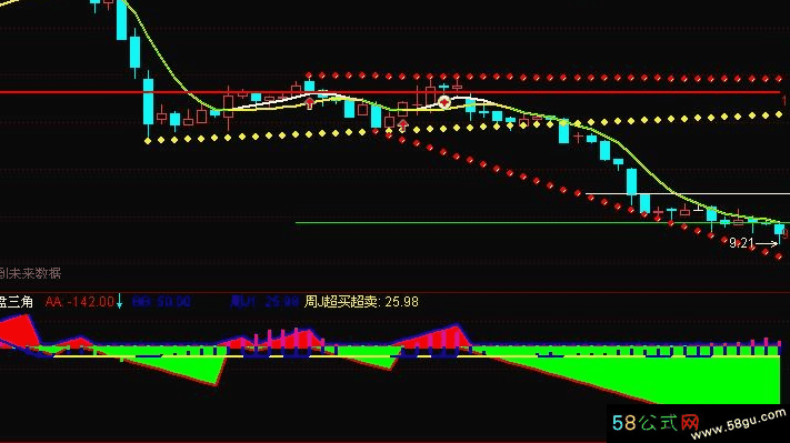 RSV:=(CLOSE-LLV(LOW,9))/(HHV(HIGH,9)-LLV(LOW,9))*100; K:=SMA(RSV,3,1); D:=SMA(K,3,1); 周K:=MA("KDJ.K#WEEK"(9,3,3),5); 周D:=MA("KDJ.D#WEEK"(9,3,3),5); 周J:=MA("KDJ.J#WEEK"(9,3,3),5); 关注区:STICKLINE(周J>=REF(周J,1) AND 周J<0,-50,50,5,0),COLORAA66CC; {STICKLINE(周J>=REF(周J,1) AND 周J>=0,50,150,5,0),COLORCC99CC;} AA:-BARSLAST(EMA(CLOSE,5)>REF(EMA(CLOSE,5),1))*8+50,COLOR0000FF,LINETHICK5; BB:BARSLAST(EMA(CLOSE,5)<REF(EMA(CLOSE,5),1))*8+50,COLORFF0000,LINETHICK5; {DRAWBAND(REF(AA,1),RGB(200,105,255),AA,RGB(200,65,180));} DRAWBAND(50,RGB(0,255,0),AA,RGB(0,0,0)); {DRAWBAND(BB,RGB(50,0,0),REF(BB,1),RGB(0,0,255));} DRAWBAND(BB,RGB(255,0,0),50,RGB(0,0,0)); STICKLINE(周K>=周D,50,2*(周K-周D)+50,0.01,0),COLORCC0099; STICKLINE(周K<周D,50,2*(周K-周D)+50,0.01,0)*2,COLORCC0000; STICKLINE(K>=D,50,2*(K-D)+50,0.01,0)*2,COLORFF00FF; STICKLINE(K<D,50,2*(K-D)+50,0.01,0)*2,COLOR00FF00; 周J1:MA("KDJ.J#WEEK"(9,3,3) ,5),COLORFF0000,LINETHICK2; 周J超买超卖:IF(周J1>=REF(周J1,1),周J1,DRAWNULL),COLOR00FFFF,LINETHICK2;