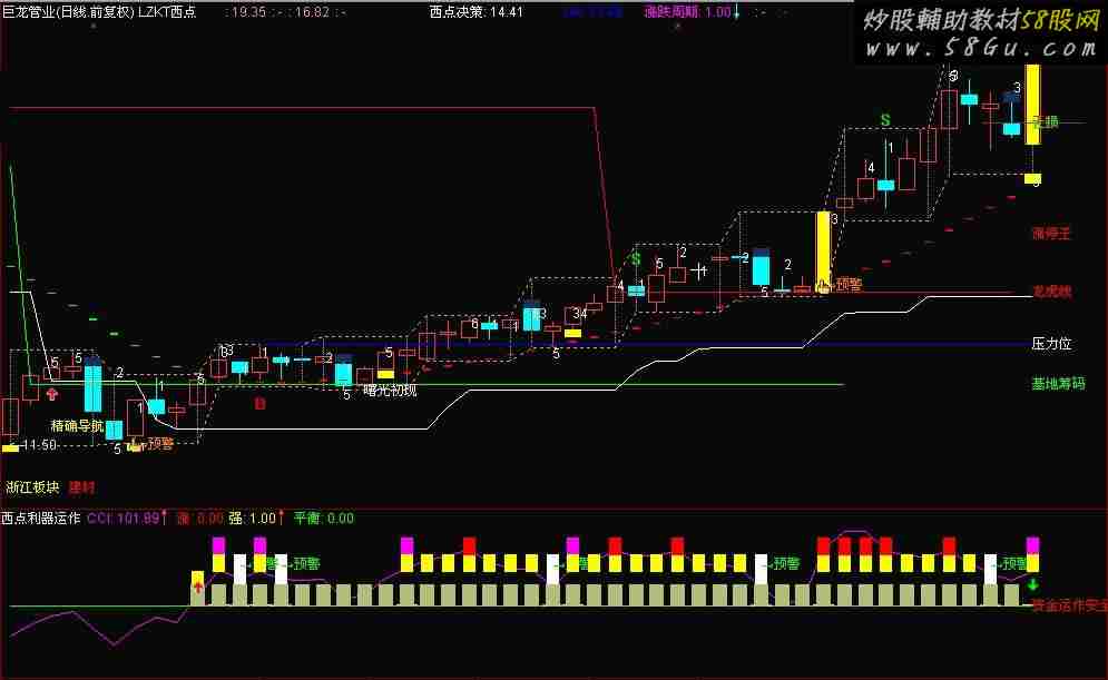 TYP:=(HIGH + LOW + CLOSE)/3; CCI:(TYP-MA(TYP,14))*100/(1.5*AVEDEV(TYP,14)),COLORFF00FF; 涨:CROSS(CCI,0),COLOR0000FF; 强:CROSS(CCI,100),COLORYELLOW; 平衡:CROSS(100,CCI) AND CCI>0,COLOR00FF00; STICKLINE(涨,0,100,2,0),COLORYELLOW; DRAWTEXT(涨,80,涨),POINTDOT,COLOR0000FF; STICKLINE(强,100,200,2,0),COLORFF00FF; DRAWTEXT(强,200,强),POINTDOT,COLOR00FF00; STICKLINE(平衡,150,50,2,0),COLORWHITE; DRAWTEXT(平衡,120,平衡),COLOR00FF00; STICKLINE(CCI>=100,100,150,2,0),COLORYELLOW; STICKLINE(CCI>=150,150,200,2,0),COLORRED; STICKLINE(CCI<=-150,-150,-200,2,0),COLORFF6600; 个股资金指数:=EMA(((100 * (CLOSE - LLV(LOW,34))) / (HHV(HIGH,34) - LLV(LOW,34))),3); 市场资金指数:=EMA(((100 * (INDEXC - LLV(INDEXL,34))) / (HHV(INDEXH,34) - LLV(INDEXL,34))),3); 资金运作安全区:STICKLINE((市场资金指数 > 50),0,60,2.5,0),COLOR7BBEB2; DRAWICON(CROSS(50,市场资金指数),50,2); DRAWICON(CROSS(市场资金指数,50),50,1); DRAWTEXT(ISLASTBAR,资金运作安全区,'资金运作安全区'),COLORRED ;