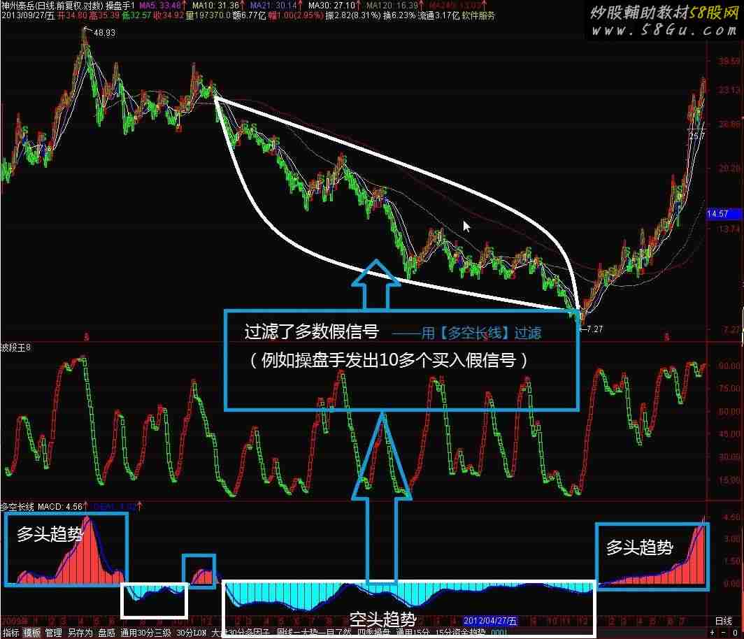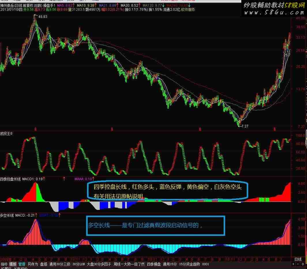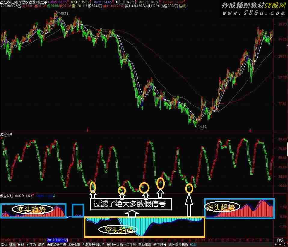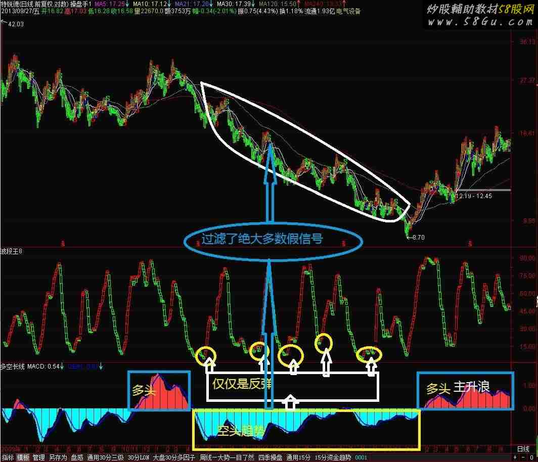 真假启动信号、真假黑马信号的过滤!——三级滤网过滤交易系统之具体运用!最牛【真假黑马】【真假启动】照妖镜!,本方法绝对简单、直观、一目了然:绝对不含未来函数其中的波段王,是本人自己编制的源码,绝对不含未来函数!源码都是公开的。没设密码! 目前,论坛上黑马指标,追涨停板指标泛滥,我看了一下,太多太乱了,很多朋友不辨信号真伪,即便是最顶尖的黑马或涨停板指标,其成功率也不是特别高,但是:如何过滤真假信号,这种含金量比较高的帖子,反而是寥寥无几! 俗话说:看大势者赚大钱,今天就如何过滤假信号,抛砖引玉,谈一点个人见解,也请高手添砖加瓦,贡献自己的绝活。 本人炒股10多年,前5年大亏,后5年才大赚,有感很多朋友像我过去一样困苦无助,特倾囊奉献自己的绝活!个人感觉:过滤方法:1:最好的过滤方法是盘感——它可以【透视主力的底牌】,用它来过滤真假启动、真假突破,主力做盘意图等等,一目了然;但是:十分可惜,盘感这东西,只可意会,不可言传。很难用几句话说清楚,更难以用公式来描述。当然,各种选股指标,还是有它的存在价值的——能够快速从2000只股票中【快速发现量、价异动的股票】,这不是人工选股能够胜任的,尤其是开盘不久牛股拉升的异动,指标选股,优势得天独厚!2:要有辩证思维————指标、方法要会变通,要懂长线、中线、短线的辩证关系: 说具体点:短线依托长线,就可以过滤多数假信号,长线配合短线,就可以波段操作,用最小的止损换取最大的波段利润。 【多空长线指标】,其实就是MACD改编的,你只要按照MACD参数的设置方法,进行修改就可以了!3:换句话说:可以用【长线趋势】+【波段王】+【操盘手】过滤绝大多数(80%)假信号!当然过滤最主要看的是【长线趋势】。4:这套系统,既可以过滤多数假信号,又可以直观醒目的看出短线多空状态,它凝聚了【三级滤网过滤交易系统】的精华,长、中、短兼顾,波段王和操盘手一旦由红变色,立即止损,绝不会深套!,换句话说,【三级滤网过滤交易系统】是一个用小的止损换取大的波段利润的高胜算交易系统。 如果你要过滤选股,可以添加附加条件【综合条件选股】:【多空长线】指标:最好是:DIF>DEA AND DIF>0; 最低要求【多空长线】指标 DIF>0; tne格式的通达信公式,需要通达信5.0公式管理器的版本,下面还放上了文本的公式源码,喜欢哪个就下载哪个 5:最后特别注明:指标的生命在于参数不断优化——,可能会有些朋友反应,有个别股票的【多空长线】信号不是特别清晰、醒目! 解决方法:要辩证的去用,里面的参数,最好依据不同的品种进行优化测试,其实,做过程序化交易的朋友,都懂的:指标的生命在于参数不断优化,以适应新的行情变化(不同的品种,不同的阶段,参数可能有很大的不同), 哪怕是再厉害的程序化交易模型,也要根据不同的品种,不同的历史阶段,测试与之匹配的最佳的指标参数。操盘手1MA5:MA(C,5),COLORF00FF0; MA10:MA(C,10),COLORYELLOW; MA21:MA(C,21),COLORE66878; MA30:MA(C,30),COLORWHITE; MA120:MA(C,120),COLOR399C7F,POINTDOT; MA240:MA(C,240),COLOR000999,POINTDOT; X1:=(C+L+H)/3; X2:=EMA(X1,6); X3:=EMA(X2,5); DRAWICON(CROSS(X2,X3),L*0.98,7); DRAWICON(CROSS(X3,X2),H*1.02,8); STICKLINE(X2>=X3,LOW,HIGH,0.1,1),COLORRED; STICKLINE(X2>=X3,CLOSE,OPEN,2,2),COLORRED; STICKLINE(X2>=X3,CLOSE,OPEN,2,8),COLORBROWN; STICKLINE(X2<X3,LOW,HIGH,0.1,1),COLORGREEN; STICKLINE(X2<X3,CLOSE,OPEN,2,2),COLORGREEN; STICKLINE(CROSS(X2,X3),OPEN,CLOSE,2,1),COLORYELLOW; STICKLINE(CROSS(X3,X2),OPEN,CLOSE,2,1),COLORBLUE;----------------------------------------------------波段王1{不含未来函数,2013/7/21最新修改}RSV:=(CLOSE-LLV(LOW,35))/(HHV(HIGH,35)-LLV(LOW,35))*100;K:=SMA(RSV,5,1);D:=MA(K,7);E:=MA(K,3);J:=3*K-2*D;STICKLINE((K-D>0),K,E,8,1),COLORRED;STICKLINE((K-D<0),K,E,8,1),COLORGREEN;--------------------------------------------------------多空长线{用法:与MACD相近,会MACD就可以,金叉买,死叉卖,0轴上多是主升浪,0轴下多是反弹}DIF:=EMA(CLOSE,35)-EMA(CLOSE,70);DEA:=EMA(DIF,12);MACD:DIF,COLORSTICK;DEA1:EMA(DIF,12),COLORBLUE,LINETHICK2;