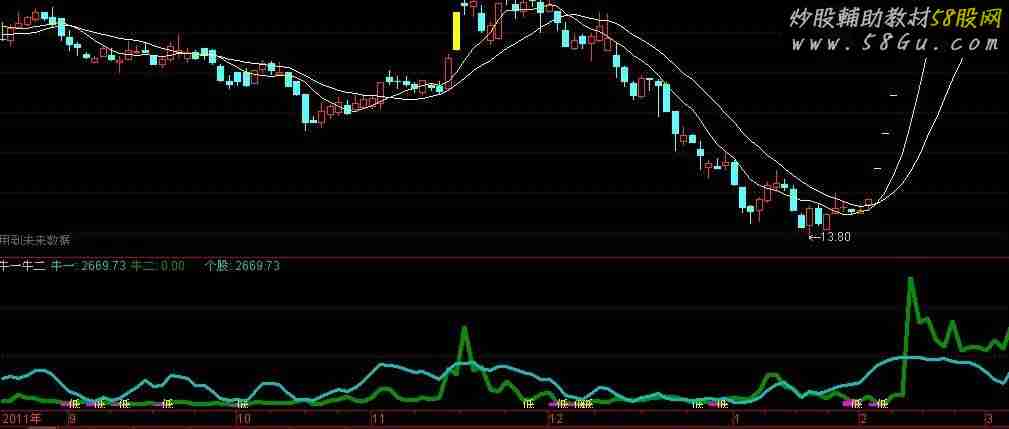 说明: 1:牛二上行;2:牛一穿牛二上行;3:7.5日均线上穿15日均线。