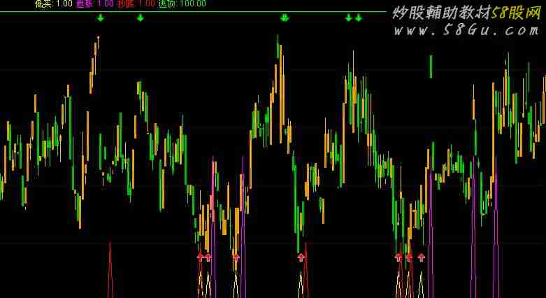 {魔鬼K线} N1:=6; LC:=REF(C,1); LO:=REF(O,1); LH:=REF(H,1); LL:=REF(L,1); D1:=SMA(MAX(C-LC,0),N1,1)/SMA(ABS(C-LC),N1,1)*100; D2:=SMA(MAX(O-LO,0),N1,1)/SMA(ABS(O-LO),N1,1)*100; D3:=SMA(MAX(H-LH,0),N1,1)/SMA(ABS(H-LH),N1,1)*100; D4:=SMA(MAX(L-LL,0),N1,1)/SMA(ABS(L-LL),N1,1)*100; STICKLINE(D1>=D2,D1,D2,3,0),COLOR0055AA; STICKLINE(D1<=D2,D1,D2,3,0),COLOR006600; STICKLINE(D1>=D2,D1,D2,2,0),COLOR0077CC; STICKLINE(D1>=D2,D1,D2,1,0),COLOR0099DD; STICKLINE(D1>=D2,D3,D4,0,0),COLOR00BBFF; STICKLINE(D1<=D2,D1,D2,2,0),COLOR009900; STICKLINE(D1<=D2,D1,D2,1,0),COLOR00BB00; STICKLINE(D1<=D2,D3,D4,0,0),COLOR00EE00; DRAWICON(CROSS(RSI,25),15,1); DRAWICON(CROSS(75,RSI),97,2); DRAWICON(CROSS(80,RSI),97,2); VAR10:=CROSS(RSI,25) AND EMA(EMA((((2*C+H+L)/4)-LLV(LOW,30))/(HHV(HIGH,30)-LLV(LOW,30))*100,8),5)<55; 低买:IF(VAR10,10,1),COLORYELLOW; VAR12:=CROSS(EMA((((2*C+H+L)/4)-LLV(LOW,30))/(HHV(HIGH,30)-LLV(LOW,30))*100,8),15) AND EMA(EMA((((2*C+H+L)/4)-LLV(LOW,30))/(HHV(HIGH,30)-LLV(LOW,30))*100,8),5)<55; 追涨:IF(VAR12,50,1),COLORMAGENTA; 抄底:IF(CROSS(D3,EMA((((2*C+H+L)/4)-LLV(LOW,30))/(HHV(HIGH,30)-LLV(LOW,30))*100,8)) AND SMA(MAX(H-LH,0),N1,1)/SMA(ABS(H-LH),N1,1)*100<53,20,1),COLORRED; 逃顶:IF(CROSS(EMA((((2*C+H+L)/4)-LLV(LOW,30))/(HHV(HIGH,30)-LLV(LOW,30))*100,8),78) AND EMA((((2*C+H+L)/4)-LLV(LOW,30))/(HHV(HIGH,30)-LLV(LOW,30))*100,8)>60,70,100),COLORGREEN; |