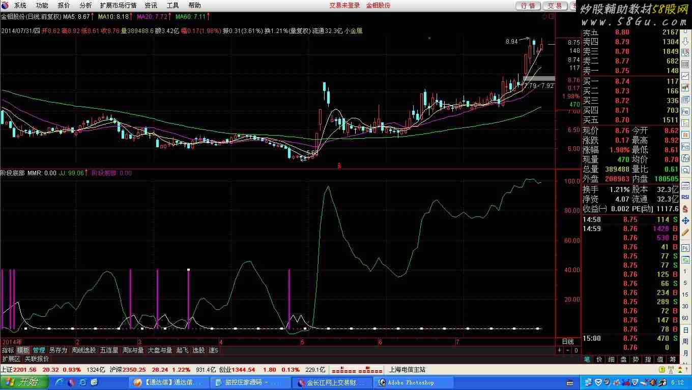 {阶段底部} R12:=(SMA(ABS(L-REF(L,1)),12,1))/(SMA(MAX(L-REF(L,1),0),12,1))*4; MR12:=EMA(R12,12); MMR:EMA(IF(L<=LLV(L,34),MR12,0),3); JJ:3*SMA((C-LLV(L,60))/(HHV(H,60)-LLV(L,60))*100,5,1)-2* SMA(SMA((C-LLV(L,60))/(HHV(H,60)-LLV(L,60))*100,5,1),5,1),COLOR00DD00; 阶段底部:IF(MMR>JJ AND MMR>2 AND C=LLV(C,10) AND L=LLV(L,10),40,0),STICK,COLORAA00BB,LINETHICK3