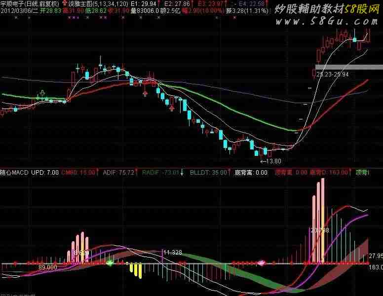 UPD:COUNT(C>=O OR C>=REF(C,1),8) NODRAW; CM60:BARSLAST(LONGCROSS(C,MA(C,60),8))+1 NODRAW COLORRED; DIFF:=EMA(CLOSE,12)-EMA(CLOSE,24); DEA:=EMA(DIFF,9); ADIF:ATAN((DIFF/REF(DIFF,1)-1)*100)*180/3.1416 NODRAW; RADIF:REF(ADIF,1) NODRAW;C2:=IF(V>MA(V,150)*0.98,0.1,-0.1); C1:=IF(V<MA(V,150)*0.98,-0.1,0.1);B2:=EMA(CLOSE,55)-MA(CLOSE,60) DOTLINE COLORGREEN; B3:=EMA(B2,9) DOTLINE COLORCYAN; DRAWBAND(B2,RGB(120,50,50),B3,RGB(50,120,50)); MACD:=2*(DIFF-DEA), STICK,LINETHICK1 COLORCYAN;N:=20; MID:=MA(C,20); VART1:=POW((C-MID),2); VART2:=MA(VART1,N); VART3:=SQRT(VART2); UPPER:=MID+2*VART3; LOWER:=MID-2*VART3; BOLL:=REF(MID,1),COLORGREEN; UB:=REF(UPPER,1),COLOR00FFFF; LB:=REF(LOWER,1),COLOR00FFFF NODRAW;BLTJ:=REF(L,1)<REF(LB,1) AND L>LB; BLLDT:BARSLAST(BLTJ ) NODRAW; JCCOUNT:=COUNT(CROSS(DIFF,DEA),BARSLAST(DEA>=0));A1:=BARSLAST(REF(CROSS(DIFF,DEA),1)) COLORRED NODRAW; 底背离:REF(CLOSE,A1+1)>CLOSE AND DIFF>REF(DIFF,A1+1) AND CROSS(DIFF,DEA) NODRAW; STICKLINE(底背离,0,0.03,1.2,1),COLOR00FF00; {底背:DRAWLINE(A1=0,DEA,底背离,DEA,0),COLORRED,LINETHICK2 CROSSDOT;} DRAWTEXT(底背离,0.1,' 底背离'),COLORFF00FF; A2:=BARSLAST(REF(CROSS(DEA,DIFF),1)) ; 顶背离:REF(CLOSE,A2+1)<CLOSE AND REF(DIFF,A2+1)>DIFF AND CROSS(DEA,DIFF) CROSSDOT COLORRED NODRAW; {顶背:DRAWLINE(A2=0,DEA,顶背离,DEA,0),COLORBLUE,LINETHICK2 CROSSDOT;} 底背D:BARSLAST(底背离)+1 NODRAW COLORRED; 顶背D:A2+1 COLORGREEN NODRAW; {判断天地量} AA:=SUMBARS(VOL,CAPITAL); 地量:=VOL<MA(VOL,AA)*21/100 AND VOL>0; 天量:=VOL>MA(VOL,AA)*34/10 ; MACDA:2*(DIFF-DEA), STICK,LINETHICK1 COLORCYAN;NOTEXT3:IF(地量 AND PERIOD>4,MACD*1.5,DRAWNULL) STICK LINETHICK6 COLORYELLOW; NOTEXT4:IF(天量 AND PERIOD>4,MACD*1.5,DRAWNULL) STICK LINETHICK6 COLORAAAAFF; NOTEXT5:IF(V<=MA(V,5)*0.22,MACD,DRAWNULL) STICK LINETHICK4 COLORBLUE; NOTEXT:IF(REF(MACD,1)<=MACD,MACD,DRAWNULL) STICK COLORRED; NOTEXT1:0 LINETHICK3 COLORGRAY;NOTEXT8:IF(V>MA(V,150)*0.98,0,DRAWNULL) COLORRED LINETHICK2 CIRCLEDOT ;DEAA:DEA COLORYELLOW; DIFA:DIFF COLORWHITE ;DIFF1:EMA(CLOSE,12)-EMA(CLOSE,26) DOTLINE COLORGREEN NODRAW; DEA1:EMA(DIFF1,9) DOTLINE COLORCYAN NODRAW; 底背:DRAWLINE(A1=0,DEA,底背离,DEA,0),COLORRED,LINETHICK2 CROSSDOT; 顶背:DRAWLINE(A2=0,DEA,顶背离,DEA,0),COLORBLUE,LINETHICK2 CROSSDOT; 强:IF(DIFF>MA(DIFF,2),DIFF,DRAWNULL),COLORRED LINETHICK2; 弱:IF(DEA>MA(DEA,2),DEA,DRAWNULL),COLORMAGENTA LINETHICK2;必买: DRAWICON(REF(TROUGHBARS(3,15,1),1)=0 AND HIGH>LOW,0,25),COLORRED ,LINETHICK4; 必卖: DRAWICON(REF(PEAKBARS(3,15,1),1)=1,0,27),COLORRED,LINETHICK8;B1:A1 NODRAW; TOP:A2 NODRAW; BSR:((BIDORDERVOL-BIDCANCELVOL)/(OFFERORDERVOL-OFFERCANCELVOL)-1)*10 NODRAW; NOTEXTBRS:IF(BSR>0,DEA,DRAWNULL) COLORFFFFFF LINETHICK2 CIRCLEDOT; HSJ:=BARSLAST(CROSS(DIFF,0) AND DIFF>=0 )+1 NODRAW; LSJ:=BARSLAST(CROSS(0,DIFF) AND DIFF<0 )+1 NODRAW; T:IF(DIFF>0,HSJ,LSJ) NODRAW; IF(T=1,ABS(MACD),0) STICK LINETHICK2 COLORMAGENTA;IF(CROSS(DEA,0),ABS(MACD),0) STICK LINETHICK2 COLORYELLOW; S:IF(HSJ>1,SUM(ABS(MACD),T),DRAWNULL) NODRAW ;DRAWNUMBER(ISLASTBAR ,ABS(MACD*1.02),S) COLORYELLOW; DRAWNUMBER(T=1 ,ABS(MACD*1.02),REF(S,1)) ; T2:REF(T,T)+T NODRAW; Q1S:REF(S,T) NODRAW; Q2S:=REF(S,T2) NODRAW; BL:=Q1S/Q2S NODRAW;{E2T:BARSLAST(CROSS(DIF,DEA) AND FILTER(CROSS(DIF,DEA) ,5) )+1 NODRAW; E6T:BARSLAST(CROSS(DEA,DIF) AND FILTER(CROSS(DEA,DIF) ,5) )+1 NODRAW; ET:IF(DIF>=DEA,E2T,E6T) NODRAW; ES:SUM(ABS(DIF-DEA),ET) NODRAW; BZ:=MAX(ABS(DEA),ABS(DIF)); XS:=IF(DIF<0,-1,1); IF(ET=1,DIF,DRAWNULL) CIRCLEDOT LINETHICK2; DRAWNUMBER(ISLASTBAR ,DIF*1.05,ES) COLORYELLOW; DRAWNUMBER(ET=1 ,BZ*XS*1.05,REF(ES,1)) COLORYELLOW;}; TTJ:=IF(BARSLAST(顶背离=1)+1=144 OR BARSLAST(顶背离=1)+1=89 OR BARSLAST(顶背离=1)+1=13 OR BARSLAST(顶背离=1)+1=47 OR BARSLAST(顶背离=1)+1=1 OR BARSLAST(顶背离=1)+1=8 OR BARSLAST(顶背离=1)+1=21 OR BARSLAST(顶背离=1)+1=34 OR BARSLAST(顶背离=1)+1=55,1,O) ; TTJA:=IF( BARSLAST(底背离=1)+1=144 OR BARSLAST(底背离=1)+1=89 OR BARSLAST(底背离=1)+1=8 OR BARSLAST(底背离=1)+1=1 OR BARSLAST(底背离=1)+1=47 OR BARSLAST(底背离=1)+1=13 OR BARSLAST(底背离=1)+1=21 OR BARSLAST(底背离=1)+1=34 OR BARSLAST(底背离=1)+1=55,1,O) ;DRAWNUMBER((BARSLAST(顶背离=1)+1<144 AND TTJ=1 AND CURRBARSCOUNT<233) OR ISLASTBAR,MIN(DIFF,DEA)*0.98,BARSLAST(顶背离=1)+1) COLORGREEN; DRAWNUMBER((BARSLAST(底背离=1)+1<144 AND TTJA=1 AND CURRBARSCOUNT<233)OR ISLASTBAR,0,BARSLAST(底背离=1)+1) COLORYELLOW;