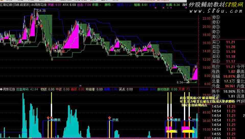 控盘筹码:-(0.1-WINNER(C/1.1))*100,STICK,COLORLIBLUE,LINETHICK4; STICKLINE(100,0,-15,5,0),COLORBLACK; LGL:=IF(EMA(C,5)/EMA(EMA(C,9),16)<=0.85 AND C/REF(C,1)>0.905 AND C/REF(C,1)<1.05 AND VOL/CAPITAL*100<5,50,0); WR1:=-100*(HHV(HIGH,34)-CLOSE)/(HHV(HIGH,34)-LLV(LOW,34))+100; WR2:=-100*(HHV(HIGH,50)-CLOSE)/(HHV(HIGH,50)-LLV(LOW,50))+100; WR3:=-100*(HHV(HIGH,70)-CLOSE)/(HHV(HIGH,70)-LLV(LOW,70))+100; BIAS1 := ((CLOSE-MA(CLOSE,34))/MA(CLOSE,34)*100+10)*5; BIAS2 := ((CLOSE-MA(CLOSE,50))/MA(CLOSE,50)*100+10)*5; BIAS3 := ((CLOSE-MA(CLOSE,70))/MA(CLOSE,70)*100+10)*5; S1:=(WR1+WR2+WR3+BIAS1+BIAS2+BIAS3)/6; S2:=EMA(S1,3); S3:=ABS(BIAS1-BIAS3); SX:=(S1+S3)/2; XC1:=(-1)*(EMA(100*(1-WINNER(CLOSE)),1)-50)+50; CCC:=XC1+SX; ZJZ:=IF( LGL>0 AND CCC<0,200,0); LXL:=IF(SX<0 AND C=LLV(C,5) AND C/REF(C,1)>0.905 AND C/REF(C,1)<1.05 AND VOL/CAPITAL*100<5,-50,0); JBJ:=IF(CCC<0 AND LXL=-50,100,0); MA3:= MA(C,3); C0:=REF(C,2)*0.865; C1:=REF(C,13)*0.772; BOT:=MIN(C0,C1); HSL:=100*VOL/CAPITAL; MA13:=MA(C,13); CXC:=IF((C-BOT)/C<3/100 AND SUM(HSL,5)/5<1.8,1,0); VMC:=IF(CXC>0 AND (LXL<0 OR LGL>0),100,0); V满仓:=VMC; V半仓A:=IF(((ZJZ>0 AND JBJ>0 AND SUM(VOL/CAPITAL*100,5)/5<1) OR (CXC>0 AND REF(C,1)/REF(C,2)>0.902)) OR (((ZJZ>0 AND JBJ>0 AND SUM(VOL/CAPITAL*100,5)/5<1) OR CXC>0) AND (LXL<0 OR LGL>0)) AND VMC<10 ,50,0) ; V93:=(((ZJZ>0 AND JBJ>0 AND SUM(VOL/CAPITAL*100,5)/5<1) OR CXC>0) AND (LXL<0 OR LGL>0)) ; V90:=((ZJZ>0 AND JBJ>0 AND SUM(VOL/CAPITAL*100,5)/5<1) OR (CXC>0 AND REF(C,1)/REF(C,2)>0.902)); V半仓:=V93 OR V90; XMM87:=V满仓 OR V半仓; XMM91:=VMC; G:=MA(CLOSE,80)-MA(CLOSE,10)/3; VAR2Q:=(MA(CLOSE,80)-MA(CLOSE,13)/3); 神奇线:=MA((CLOSE-VAR2Q)/VAR2Q,1),COLORRED,LINETHICK2;稳赚:IF(COUNT(神奇线>REF(神奇线,1),30)<3 AND COUNT(神奇线<10,10)<0.5 AND REF(神奇线,3)=LLV(神奇线,10),10,0); 天下无敌: IF(REF(神奇线,2)=LLV(神奇线,20) AND REF(神奇线,2)<0.071 AND REF(神奇线,2)<REF(神奇线,1) AND NOT(REF(LOW,1)>REF(HIGH,2) AND LOW>REF(HIGH,1)) AND CLOSE>REF(CLOSE,1),2,0)*20; STICKLINE(天下无敌,0,30,12,0),COLOR0000FF; STICKLINE(天下无敌,30,60,10,0),COLORWHITE; STICKLINE(天下无敌,60,80,6,0),COLORYELLOW; DRAWTEXT(天下无敌,40,'买'),COLORFF00FF;VAR111:=(MA(CLOSE,80)-MA(CLOSE,13)/3); VAR211:=( MA((CLOSE-VAR111)/VAR111,1));MMA:=EMA(VAR211,12)*0.7; MMB:=EMA(VAR211,3);快到底:IF(LLV(MMB-MMA,12)>0,0,30),LINETHICK2,COLORBLUE; 底初选股:IF( CROSS(0, LLV(MMB-MMA,12)),10,0),LINETHICK0; 天使:( EMA(CLOSE,12) - EMA(CLOSE,26))*100,COLORRED,NODRAW; 魔鬼: EMA(天使,9),COLORFFFFFF,LINETHICK1,NODRAW; 上帝:= 2*(天使-魔鬼);绝对底:IF(快到底>0 AND CROSS(上帝,0),30,0),LINETHICK2,COLORMAGENTA; DRAWICON( 绝对底>0,35 ,1 ); STICKLINE(绝对底,0,30,2.7,0),COLORYELLOW; STICKLINE(绝对底,0,30,1.8,0),COLOR770077; STICKLINE(绝对底,0,30,0.9,0),COLORBB00BB; STICKLINE(绝对底,0,30,0.1,0),COLORYELLOW; DRAWTEXT(绝对底=30,35,'←抄底'),COLORCYAN;短套:=EMA(100*(1-WINNER(1.10*C)),1); 中套:=EMA(100*(1-WINNER(1.2*C)),1); 高套:=EMA(100*(1-WINNER(1.5*C)),1); 绝对底部:短套>90 AND 中套>75 AND 高套>30,COLORGREEN,NODRAW; STICKLINE(绝对底部=1,10,20,5,0),COLORMAGENTA; DRAWTEXT(绝对底部=1,15,'★底'),COLORYELLOW;
