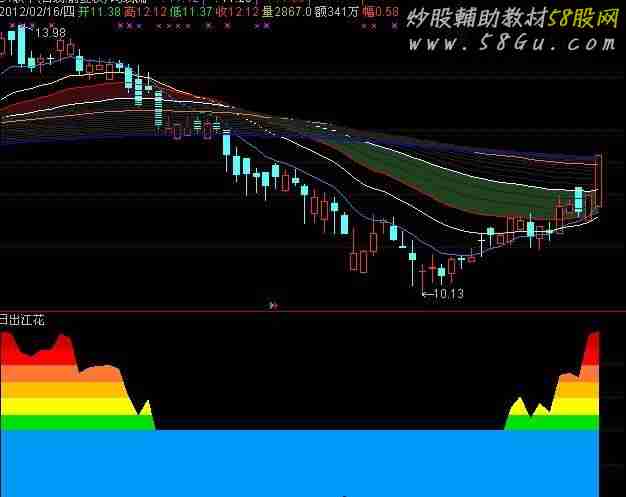 DRAWBAND(40,RGB(0,153,248),0,RGB(0,0,0)); DRAWBAND(50,RGB(0,225,0),40,RGB(0,0,0)); DRAWBAND(60,RGB(255,255,0),50,RGB(0,0,0)); DRAWBAND(70,RGB(253,190,0),60,RGB(0,0,0)); DRAWBAND(80,RGB(255,119,53),70,RGB(0,0,0)); DRAWBAND(90,RGB(255,0,0),80,RGB(0,0,0)); DRAWBAND(100,RGB(206,0,0),90,RGB(0,0,0)); 日出江花:=100*(CLOSE-LLV(LOW,30))/(HHV(CLOSE,30)-LLV(LOW,30)),COLORRED,LINETHICK2; DRAWBAND(100,RGB(0,0,0),日出江花,RGB(255,255,255)); 水下:=日出江花<=40; DRAWBAND(水下,RGB(0,153,248),40,RGB(0,153,248)); |