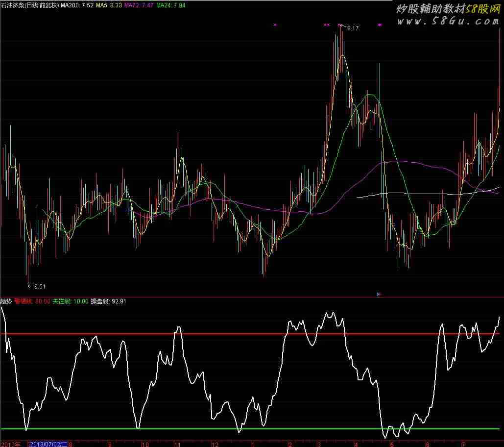 A:=EMA(100*(CLOSE-LLV(LOW,30))/(HHV(HIGH,30)-LLV(LOW,30)),3),COLORYELLOW,LINETHICK0;警惕线:80,COLORRED,LINETHICK2;关注线:10,COLORGREEN,LINETHICK2;操盘线:A,COLORWHITE,LINETHICK2;